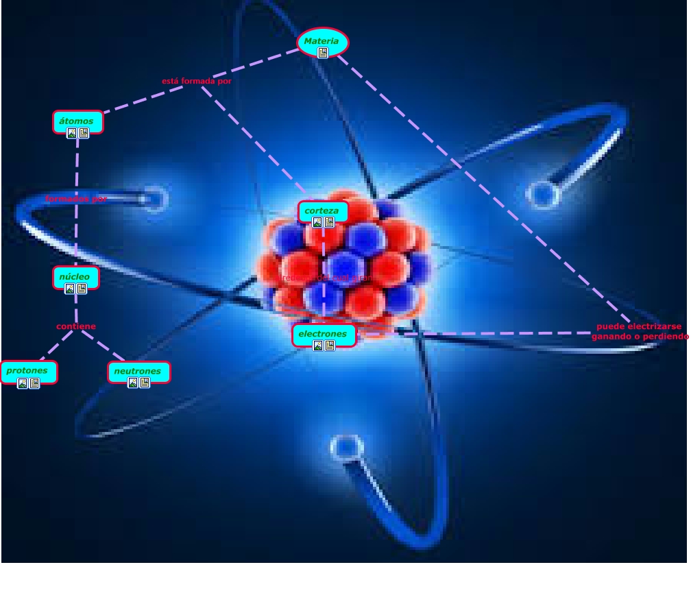 Este Cmap, tiene información relacionada con: Mapa Conceptual, núcleo contiene protones, corteza alrededor del cual giran electrones, átomos formados por núcleo, Materia puede electrizarse ganando o perdiendo electrones, núcleo contiene neutrones, Materia está formada por átomos, Materia está formada por corteza