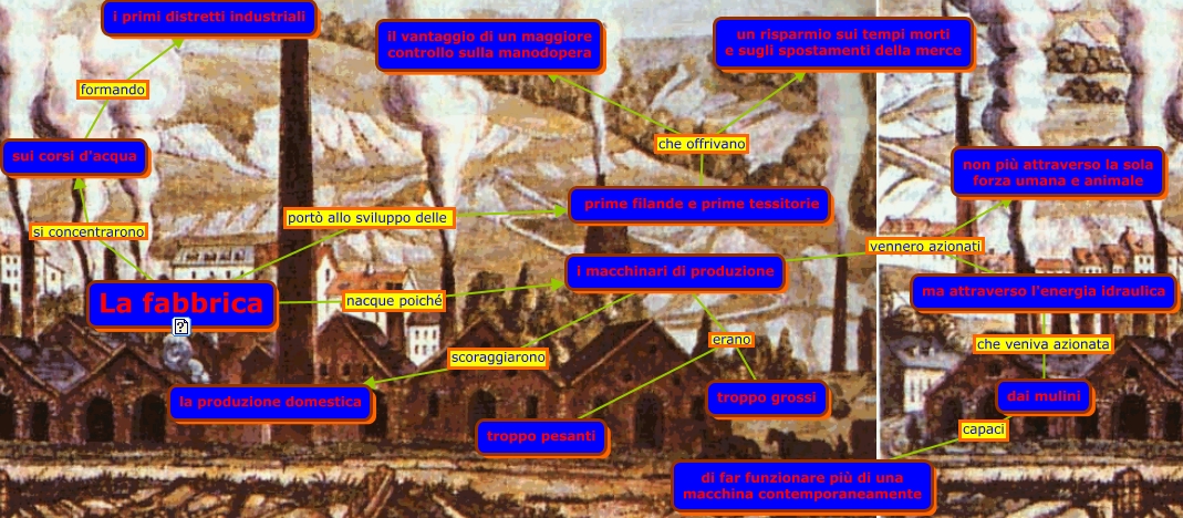 Questa Cmap, creata con IHMC CmapTools, contiene informazioni relative a: La Fabbrica, i macchinari di produzione vennero azionati ma attraverso l'energia idraulica, La fabbrica portò allo sviluppo delle prime filande e prime tessitorie, dai mulini capaci di far funzionare più di una macchina contemporaneamente, prime filande e prime tessitorie che offrivano il vantaggio di un maggiore controllo sulla manodopera, i macchinari di produzione scoraggiarono la produzione domestica, prime filande e prime tessitorie che offrivano un risparmio sui tempi morti e sugli spostamenti della merce, La fabbrica si concentrarono sui corsi d'acqua, i macchinari di produzione erano troppo pesanti, sui corsi d'acqua formando i primi distretti industriali, ma attraverso l'energia idraulica che veniva azionata dai mulini, i macchinari di produzione vennero azionati non più attraverso la sola forza umana e animale, i macchinari di produzione erano troppo grossi, La fabbrica nacque poiché i macchinari di produzione