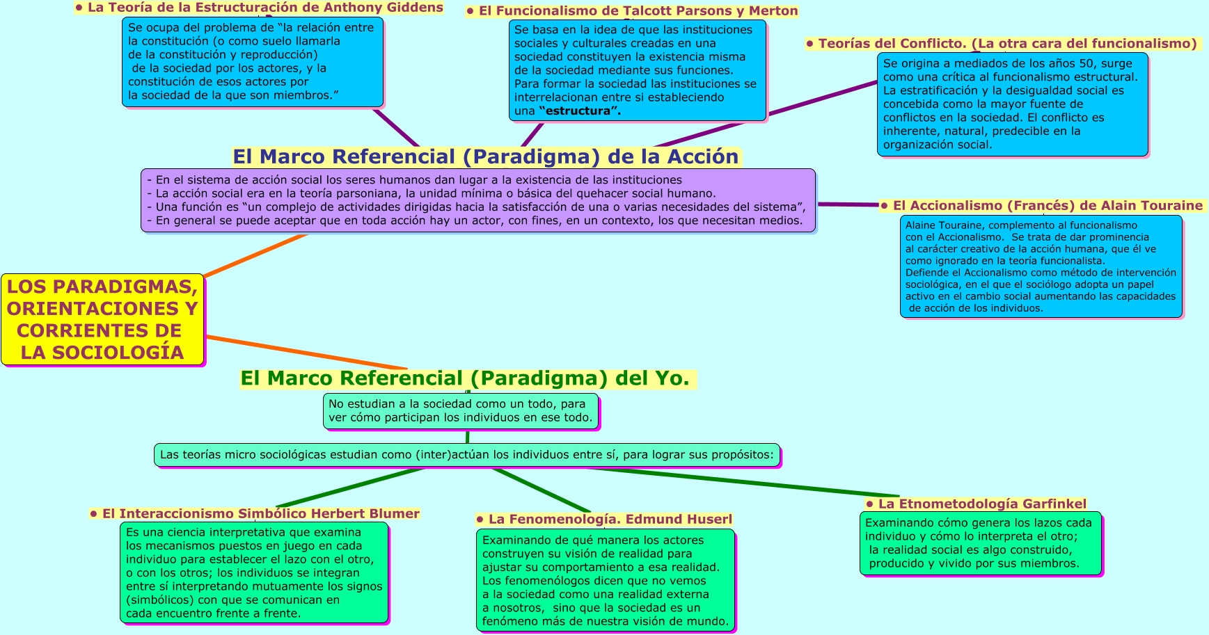 Este Cmap, tiene información relacionada con: LOS PARADIGMAS, ORIENTACIONES Y CORRIENTES DE LA SOCIOLOGIA, - En el sistema de acción social los seres humanos dan lugar a la existencia de las instituciones - La acción social era en la teoría parsoniana, la unidad mínima o básica del quehacer social humano. - Una función es “un complejo de actividades dirigidas hacia la satisfacción de una o varias necesidades del sistema”, - En general se puede aceptar que en toda acción hay un actor, con fines, en un contexto, los que necesitan medios. • Teorías del Conflicto. (La otra cara del funcionalismo) Se origina a mediados de los años 50, surge como una crítica al funcionalismo estructural. La estratificación y la desigualdad social es concebida como la mayor fuente de conflictos en la sociedad. El conflicto es inherente, natural, predecible en la organización social., - En el sistema de acción social los seres humanos dan lugar a la existencia de las instituciones - La acción social era en la teoría parsoniana, la unidad mínima o básica del quehacer social humano. - Una función es “un complejo de actividades dirigidas hacia la satisfacción de una o varias necesidades del sistema”, - En general se puede aceptar que en toda acción hay un actor, con fines, en un contexto, los que necesitan medios. • El Accionalismo (Francés) de Alain Touraine Alaine Touraine, complemento al funcionalismo con el Accionalismo. Se trata de dar prominencia al carácter creativo de la acción humana, que él ve como ignorado en la teoría funcionalista. Defiende el Accionalismo como método de intervención sociológica, en el que el sociólogo adopta un papel activo en el cambio social aumentando las capacidades de acción de los individuos., Las teorías micro sociológicas estudian como (inter)actúan los individuos entre sí, para lograr sus propósitos: • La Etnometodología Garfinkel Examinando cómo genera los lazos cada individuo y cómo lo interpreta el otro; la realidad social es algo construido, producido y vivido por sus miembros., Las teorías micro sociológicas estudian como (inter)actúan los individuos entre sí, para lograr sus propósitos: • El Interaccionismo Simbólico Herbert Blumer Es una ciencia interpretativa que examina los mecanismos puestos en juego en cada individuo para establecer el lazo con el otro, o con los otros; los individuos se integran entre sí interpretando mutuamente los signos (simbólicos) con que se comunican en cada encuentro frente a frente., - En el sistema de acción social los seres humanos dan lugar a la existencia de las instituciones - La acción social era en la teoría parsoniana, la unidad mínima o básica del quehacer social humano. - Una función es “un complejo de actividades dirigidas hacia la satisfacción de una o varias necesidades del sistema”, - En general se puede aceptar que en toda acción hay un actor, con fines, en un contexto, los que necesitan medios. • El Funcionalismo de Talcott Parsons y Merton Se basa en la idea de que las instituciones sociales y culturales creadas en una sociedad constituyen la existencia misma de la sociedad mediante sus funciones. Para formar la sociedad las instituciones se interrelacionan entre si estableciendo una “estructura”., LOS PARADIGMAS, ORIENTACIONES Y CORRIENTES DE LA SOCIOLOGÍA El Marco Referencial (Paradigma) del Yo. Las teorías micro sociológicas estudian como (inter)actúan los individuos entre sí, para lograr sus propósitos:, - En el sistema de acción social los seres humanos dan lugar a la existencia de las instituciones - La acción social era en la teoría parsoniana, la unidad mínima o básica del quehacer social humano. - Una función es “un complejo de actividades dirigidas hacia la satisfacción de una o varias necesidades del sistema”, - En general se puede aceptar que en toda acción hay un actor, con fines, en un contexto, los que necesitan medios. • La Teoría de la Estructuración de Anthony Giddens Se ocupa del problema de “la relación entre la constitución (o como suelo llamarla de la constitución y reproducción) de la sociedad por los actores, y la constitución de esos actores por la sociedad de la que son miembros.”, LOS PARADIGMAS, ORIENTACIONES Y CORRIENTES DE LA SOCIOLOGÍA El Marco Referencial (Paradigma) del Yo. No estudian a la sociedad como un todo, para ver cómo participan los individuos en ese todo., LOS PARADIGMAS, ORIENTACIONES Y CORRIENTES DE LA SOCIOLOGÍA El Marco Referencial (Paradigma) de la Acción - En el sistema de acción social los seres humanos dan lugar a la existencia de las instituciones - La acción social era en la teoría parsoniana, la unidad mínima o básica del quehacer social humano. - Una función es “un complejo de actividades dirigidas hacia la satisfacción de una o varias necesidades del sistema”, - En general se puede aceptar que en toda acción hay un actor, con fines, en un contexto, los que necesitan medios., Las teorías micro sociológicas estudian como (inter)actúan los individuos entre sí, para lograr sus propósitos: • La Fenomenología. Edmund Huserl Examinando de qué manera los actores construyen su visión de realidad para ajustar su comportamiento a esa realidad. Los fenomenólogos dicen que no vemos a la sociedad como una realidad externa a nosotros, sino que la sociedad es un fenómeno más de nuestra visión de mundo.