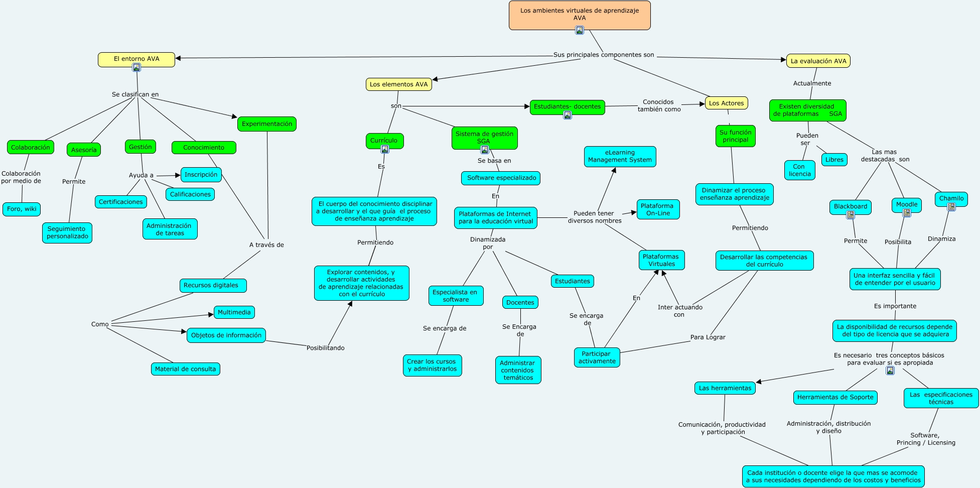 Este Cmap, tiene información relacionada con: AMBIENTES VIRTUALES DE APRENDIZAJE, Chamilo Dinamiza Una interfaz sencilla y fácil de entender por el usuario, Plataformas de Internet para la educación virtual Pueden tener diversos nombres Plataformas Virtuales, Existen diversidad de plataformas SGA Pueden ser Libres, Gestión Ayuda a Calificaciones, Plataformas de Internet para la educación virtual Pueden tener diversos nombres eLearning Management System, Colaboración Colaboración por medio de Foro, wiki, Estudiantes- docentes Conocidos también como Los Actores, Las especificaciones técnicas Software, Princing / Licensing Cada institución o docente elige la que mas se acomode a sus necesidades dependiendo de los costos y beneficios, Herramientas de Soporte Administración, distribución y diseño Cada institución o docente elige la que mas se acomode a sus necesidades dependiendo de los costos y beneficios, Currículo Es El cuerpo del conocimiento disciplinar a desarrollar y el que guía el proceso de enseñanza aprendizaje, El cuerpo del conocimiento disciplinar a desarrollar y el que guía el proceso de enseñanza aprendizaje Permitiendo ????, Plataformas de Internet para la educación virtual Dinamizada por Docentes, Recursos digitales Como Material de consulta, El entorno AVA Se clasifican en Asesoría, Docentes Se Encarga de Administrar contenidos temáticos, Los elementos AVA son Sistema de gestión SGA, Sistema de gestión SGA Se basa en Software especializado, Moodle Posibilita Una interfaz sencilla y fácil de entender por el usuario, Conocimiento A través de Recursos digitales, Desarrollar las competencias del currículo Inter actuando con Plataformas Virtuales