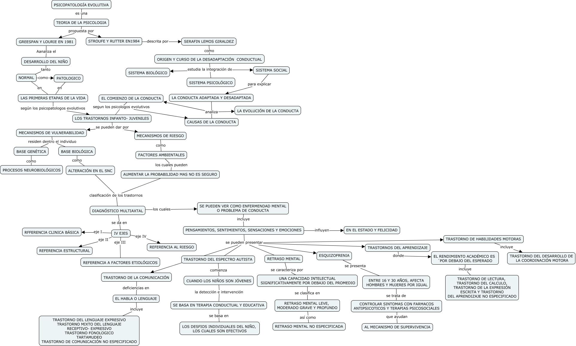 Este Cmap, tiene información relacionada con: PSICOPATOLOGIA EVOLUTIVA, ORIGEN Y CURSO DE LA DESADAPTACIÓN CONDUCTUAL estudia la integración de SISTEMA PSICOLÓGICO, LA CONDUCTA ADAPTADA Y DESADAPTADA analiza LA EVOLUCIÓN DE LA CONDUCTA, NORMAL en LAS PRIMERAS ETAPAS DE LA VIDA, NORMAL como PATOLOGICO, SE PUEDEN VER COMO ENFERMENDAD MENTAL O PROBLEMA DE CONDUCTA incluye PENSAMIENTOS, SENTIMIENTOS, SENSACIONES Y EMOCIONES, MECANISMOS DE RIESGO como FACTORES AMBIENTALES, IV EJES eje II REFERENCIA ESTRUCTURAL, EL COMIENZO DE LA CONDUCTA segun los psicologos evolutivos LOS TRASTORNOS INFANTO- JUVENILES, DIAGNÓSTICO MULTIAXTAL se da en IV EJES, PENSAMIENTOS, SENTIMIENTOS, SENSACIONES Y EMOCIONES se pueden presentar ESQUIZOFRENIA, LOS TRASTORNOS INFANTO- JUVENILES se pueden dar por MECANISMOS DE RIESGO, CUANDO LOS NIÑOS SON JÓVENES la detección e intervención SE BASA EN TERAPIA CONDUCTUAL Y EDUCATIVA, PENSAMIENTOS, SENTIMIENTOS, SENSACIONES Y EMOCIONES se pueden presentar TRASTORNO DEL ESPECTRO AUTISTA, SERAFIN LEMOS GIRALDEZ como ORIGEN Y CURSO DE LA DESADAPTACIÓN CONDUCTUAL, PENSAMIENTOS, SENTIMIENTOS, SENSACIONES Y EMOCIONES se pueden presentar TRASTORNO DE HABILIDADES MOTORAS, ENTRE 16 Y 30 AÑOS, AFECTA HOMBRES Y MUJERES POR IGUAL se trata de CONTROLAR SINTOMAS CON FARMACOS ANTIPSICOTICOS Y TERAPIAS PSICOSOCIALES, PENSAMIENTOS, SENTIMIENTOS, SENSACIONES Y EMOCIONES influyen EN EL ESTADO Y FELICIDAD, PATOLOGICO en LAS PRIMERAS ETAPAS DE LA VIDA, SE BASA EN TERAPIA CONDUCTUAL Y EDUCATIVA se basa en LOS DESFIOS INDIVIDUALES DEL NIÑO, LOS CUALES SON EFECTIVOS, TRASTORNO DE HABILIDADES MOTORAS incluye TRASTORNO DEL DESARROLLO DE LA COORDINACIÓN MOTORA