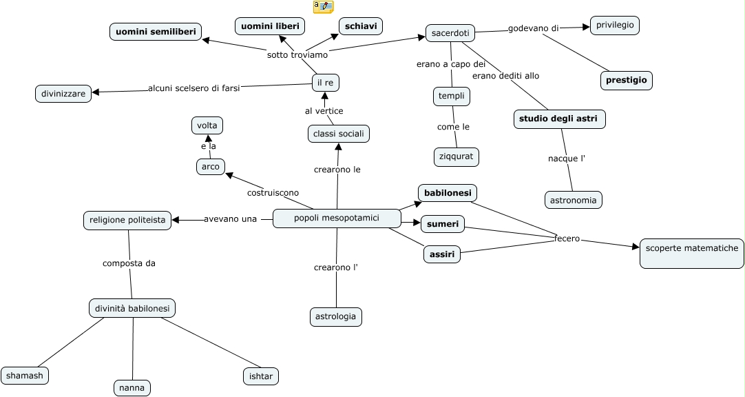 Questa Cmap, creata con IHMC CmapTools, contiene informazioni relative a: Bassanini Brocca Vairani Hoxha, popoli mesopotamici ???? babilonesi, sacerdoti erano dediti allo studio degli astri, arco e la volta, babilonesi fecero scoperte matematiche, templi come le ziqqurat, il re sotto troviamo sacerdoti, assiri fecero scoperte matematiche, popoli mesopotamici crearono l' astrologia, popoli mesopotamici costruiscono arco, il re alcuni scelsero di farsi divinizzare, popoli mesopotamici avevano una religione politeista, classi sociali al vertice il re, sumeri fecero scoperte matematiche, sacerdoti godevano di prestigio, sacerdoti godevano di privilegio, divinità babilonesi ???? nanna, popoli mesopotamici crearono le classi sociali, il re sotto troviamo schiavi, popoli mesopotamici ???? sumeri, il re sotto troviamo uomini liberi