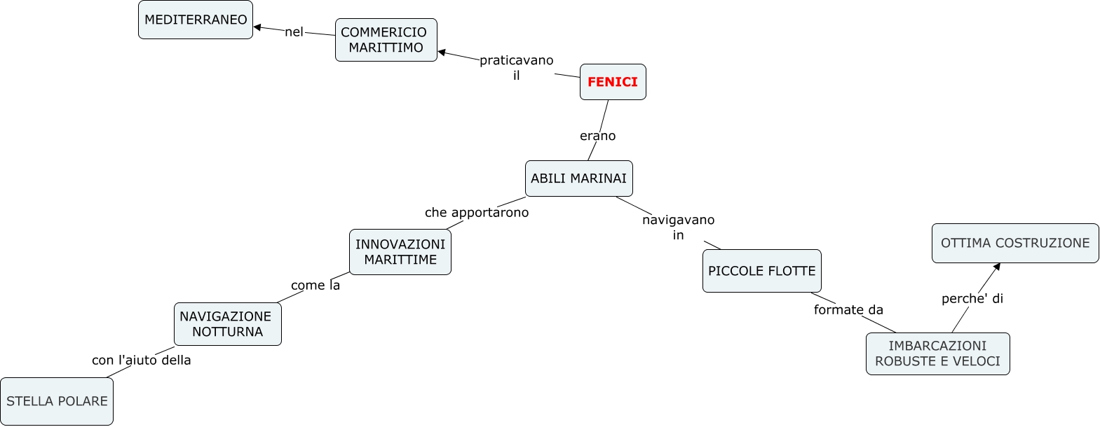Questa Cmap, creata con IHMC CmapTools, contiene informazioni relative a: un popolo di grandi navigatori e commercianti, ABILI MARINAI che apportarono INNOVAZIONI MARITTIME, FENICI praticavano il COMMERICIO MARITTIMO, FENICI erano ABILI MARINAI, INNOVAZIONI MARITTIME come la NAVIGAZIONE NOTTURNA, PICCOLE FLOTTE formate da IMBARCAZIONI ROBUSTE E VELOCI, ABILI MARINAI navigavano in PICCOLE FLOTTE, COMMERICIO MARITTIMO nel MEDITERRANEO, IMBARCAZIONI ROBUSTE E VELOCI perche' di OTTIMA COSTRUZIONE, NAVIGAZIONE NOTTURNA con l'aiuto della STELLA POLARE