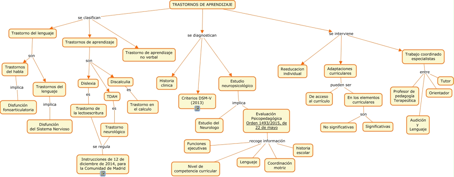 Este Cmap, tiene información relacionada con: Mapa conceptual Bases tema 2, TRASTORNOS DE APRENDIZAJE se interviene Reeducacion individual, Trastornos de aprendizaje son Discalculia, Evaluación Psicopedagógica Orden 1493/2015, de 22 de mayo recoge información historia escolar, Trabajo coordinado especialistas entre Tutor, Trastornos del habla implica Disfunción fonoarticulatoria, Trabajo coordinado especialistas entre Audición y Lenguaje, Evaluación Psicopedagógica Orden 1493/2015, de 22 de mayo recoge información Lenguaje, TRASTORNOS DE APRENDIZAJE se diagnostican Historia clinica, Evaluación Psicopedagógica Orden 1493/2015, de 22 de mayo recoge información Nivel de competencia curricular, Estudio neuropsicológico implica Evaluación Psicopedagógica Orden 1493/2015, de 22 de mayo, TRASTORNOS DE APRENDIZAJE se diagnostican Estudio neuropsicológico, Trastorno del lenguaje son Trastornos del habla, TRASTORNOS DE APRENDIZAJE se diagnostican Criterios DSM-V (2013), Trastornos del lenguaje implica Disfunción del Sistema Nervioso, Dislexia es Trastorno de la lectoescritura, En los elementos curriculares son No significativas, Adaptaciones curriculares pueden ser En los elementos curriculares, Trastornos de aprendizaje son TDAH, Trastorno de la lectoescritura se regula Trastorno neurológico, Discalculia es Trastorno en el calculo