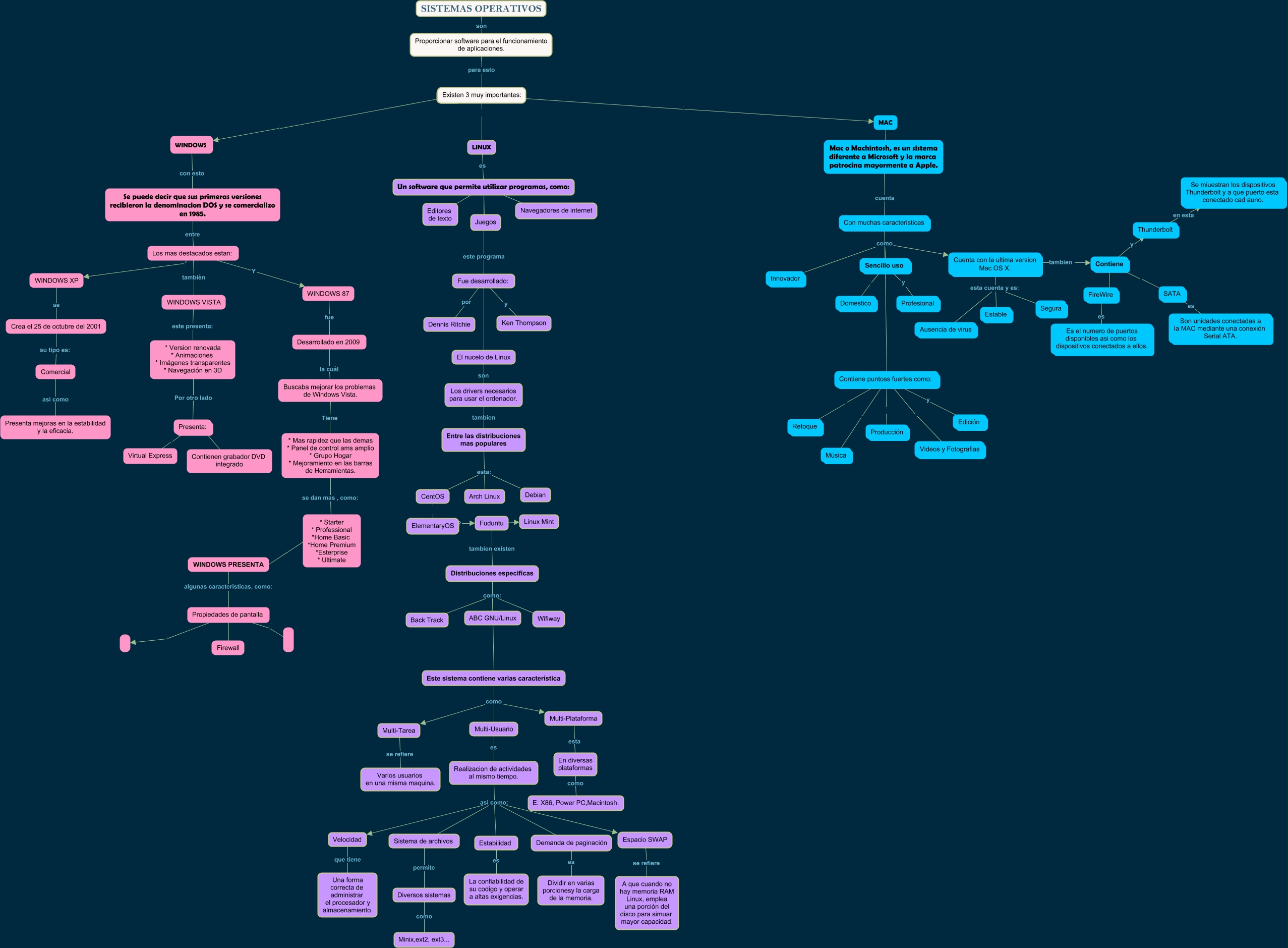Este Cmap, tiene información relacionada con: SISTEMAS OPERATIVOS, CentOS ElementaryOS, Entre las distribuciones mas populares esta: Debian, Los mas destacados estan: Y WINDOWS 87, Realizacion de actividades al mismo tiempo. asi como: Espacio SWAP, * Version renovada * Animaciones * Imágenes transparentes * Navegación en 3D Por otro lado Presenta:, Cuenta con la ultima version Mac OS X. tambien Contiene, SATA es Son unidades conectadas a la MAC mediante una conexión Serial ATA., Multi-Plataforma esta En diversas plataformas, WINDOWS con esto Se puede decir que sus primeras versiones recibieron la denominacion DOS y se comercializo en 1985., Con muchas caracteristicas como Contiene puntoss fuertes como:, Distribuciones especificas como: Este sistema contiene varias característica, Thunderbolt en esta Se miuestran los dispositivos Thunderbolt y a que puerto esta conectado cad auno., LINUX es Un software que permite utilizar programas, como:, Los drivers necesarios para usar el ordenador. tambien Entre las distribuciones mas populares, Contiene puntoss fuertes como: y Edición, Multi-Tarea se refiere Varios usuarios en una misma maquina., Mac o Machintosh, es un sistema diferente a Microsoft y la marca patrocina mayormente a Apple. cuenta Con muchas caracteristicas, En diversas plataformas como E: X86, Power PC,Macintosh., Distribuciones especificas como: Wifiway, * Starter * Professional *Home Basic *Home Premium *Esterprise * Ultimate WINDOWS PRESENTA
