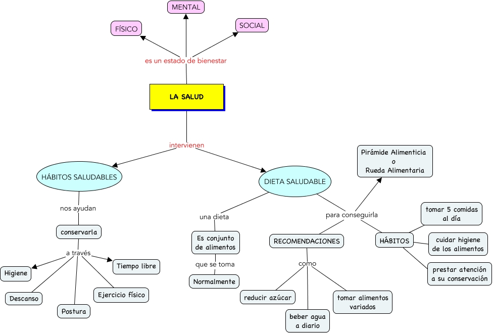 Este Cmap, tiene información relacionada con: La Salud, LA SALUD es un estado de bienestar SOCIAL, DIETA SALUDABLE para conseguirla Pirámide Alimenticia o Rueda Alimentaria, Es conjunto de alimentos que se toma Normalmente, HÁBITOS SALUDABLES nos ayudan conservarla, HÁBITOS ???? cuidar higiene de los alimentos, DIETA SALUDABLE una dieta Es conjunto de alimentos, conservarla a través Postura, LA SALUD intervienen HÁBITOS SALUDABLES, DIETA SALUDABLE para conseguirla RECOMENDACIONES, LA SALUD es un estado de bienestar FÍSICO, conservarla a través Tiempo libre, RECOMENDACIONES como tomar alimentos variados, conservarla a través Descanso, LA SALUD intervienen DIETA SALUDABLE, RECOMENDACIONES como beber agua a diario, conservarla a través Higiene, HÁBITOS ???? tomar 5 comidas al día, HÁBITOS ???? prestar atención a su conservación, RECOMENDACIONES como reducir azúcar, conservarla a través Ejercicio físico