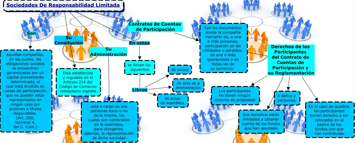 Este Cmap, tiene información relacionada con: Sociedades De Responsabilidad Limitada, Sociedades De Responsabilidad Limitada Su Consitución Esta establecida y regulada en el Artículo 214 del Código de Comercio venezolano vigente., se llevan los siguientes Libros de actas de asamblea, Sociedades De Responsabilidad Limitada Contratos de Cuentas de Participación Son los documentos donde la compañía mercantil da, a una o más personas, participación en las utilidades o pérdidas, de una o más operaciones o de todas las de su comercio., Sociedades De Responsabilidad Limitada Son aquellas compañías, en las cuales, las obligaciones sociales se encuentran garantizadas por un capital previamente determinado, el cual está dividido en cuotas de participación, que no pueden estar representadas en ningún caso por acciones o títulos negociables. (Art. 200, numeral 4, del C. Com.)., Son los documentos donde la compañía mercantil da, a una o más personas, participación en las utilidades o pérdidas, de una o más operaciones o de todas las de su comercio. Derechos de los Participantes del Contrato de Cuentas de Participación y su Reglamentación A daños y perjuicios., Sociedades De Responsabilidad Limitada En estas se llevan los siguientes, Son los documentos donde la compañía mercantil da, a una o más personas, participación en las utilidades o pérdidas, de una o más operaciones o de todas las de su comercio. Derechos de los Participantes del Contrato de Cuentas de Participación y su Reglamentación Sus derechos están limitados a obtener cuenta de los fondos que han aportado., Son los documentos donde la compañía mercantil da, a una o más personas, participación en las utilidades o pérdidas, de una o más operaciones o de todas las de su comercio. Derechos de los Participantes del Contrato de Cuentas de Participación y su Reglamentación Los participantes no tienen ningún derecho de propiedad., Son los documentos donde la compañía mercantil da, a una o más personas, participación en las utilidades o pérdidas, de una o más operaciones o de todas las de su comercio. Derechos de los Participantes del Contrato de Cuentas de Participación y su Reglamentación En el caso de quiebra, los participantes tienen derecho a ser colocados en el pasivo de los fondos con que han contribuido., Sociedades De Responsabilidad Limitada Su Administración está a cargo de dos personas socio o no de la misma, los cuales son nombrados en la asamblea, para otorgarles, además, la representación de dicha sociedad., se llevan los siguientes Libros de socios, se llevan los siguientes Libros de acta de a dministración