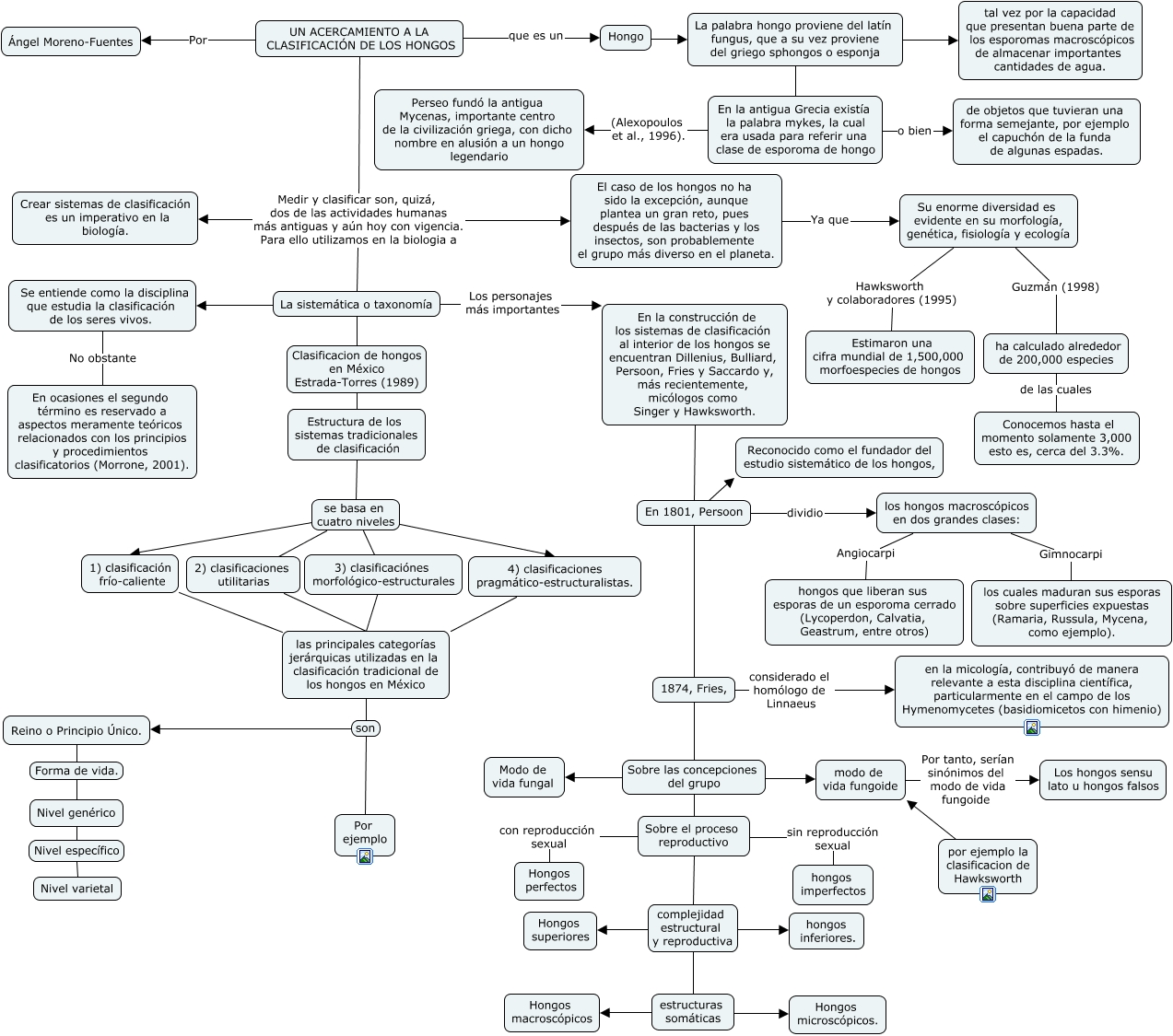 Este Cmap, tiene información relacionada con: clasificacion de los hongos, La palabra hongo proviene del latín fungus, que a su vez proviene del griego sphongos o esponja En la antigua Grecia existía la palabra mykes, la cual era usada para referir una clase de esporoma de hongo, UN ACERCAMIENTO A LA CLASIFICACIÓN DE LOS HONGOS que es un Hongo, En la antigua Grecia existía la palabra mykes, la cual era usada para referir una clase de esporoma de hongo (Alexopoulos et al., 1996). Perseo fundó la antigua Mycenas, importante centro de la civilización griega, con dicho nombre en alusión a un hongo legendario, estructuras somáticas Hongos macroscópicos, estructuras somáticas Hongos microscópicos., En 1801, Persoon 1874, Fries,, Sobre el proceso reproductivo con reproducción sexual Hongos perfectos, UN ACERCAMIENTO A LA CLASIFICACIÓN DE LOS HONGOS Medir y clasificar son, quizá, dos de las actividades humanas más antiguas y aún hoy con vigencia. Para ello utilizamos en la biologia a Crear sistemas de clasificación es un imperativo en la biología., Hongo La palabra hongo proviene del latín fungus, que a su vez proviene del griego sphongos o esponja, Nivel genérico Nivel específico Nivel varietal, 1874, Fries, considerado el homólogo de Linnaeus en la micología, contribuyó de manera relevante a esta disciplina científica, particularmente en el campo de los Hymenomycetes (basidiomicetos con himenio), los hongos macroscópicos en dos grandes clases: Angiocarpi hongos que liberan sus esporas de un esporoma cerrado (Lycoperdon, Calvatia, Geastrum, entre otros), modo de vida fungoide Por tanto, serían sinónimos del modo de vida fungoide Los hongos sensu lato u hongos falsos, UN ACERCAMIENTO A LA CLASIFICACIÓN DE LOS HONGOS Por Ángel Moreno-Fuentes, UN ACERCAMIENTO A LA CLASIFICACIÓN DE LOS HONGOS Medir y clasificar son, quizá, dos de las actividades humanas más antiguas y aún hoy con vigencia. Para ello utilizamos en la biologia a La sistemática o taxonomía, UN ACERCAMIENTO A LA CLASIFICACIÓN DE LOS HONGOS Medir y clasificar son, quizá, dos de las actividades humanas más antiguas y aún hoy con vigencia. Para ello utilizamos en la biologia a El caso de los hongos no ha sido la excepción, aunque plantea un gran reto, pues después de las bacterias y los insectos, son probablemente el grupo más diverso en el planeta., Estructura de los sistemas tradicionales de clasificación se basa en cuatro niveles 4) clasificaciones pragmático-estructuralistas., las principales categorías jerárquicas utilizadas en la clasificación tradicional de los hongos en México son Reino o Principio Único., las principales categorías jerárquicas utilizadas en la clasificación tradicional de los hongos en México son Por ejemplo, Su enorme diversidad es evidente en su morfología, genética, fisiología y ecología Hawksworth y colaboradores (1995) Estimaron una cifra mundial de 1,500,000 morfoespecies de hongos