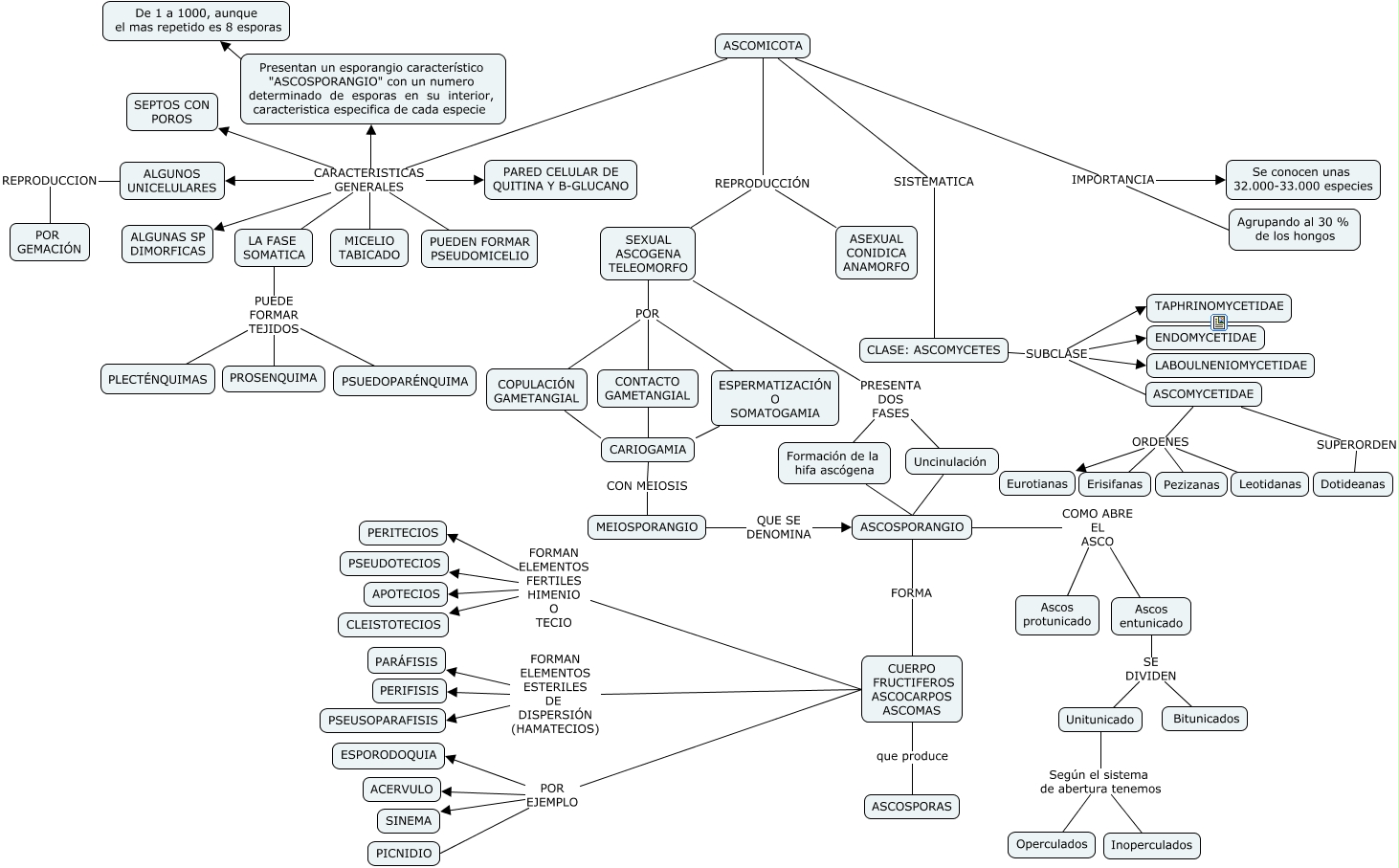 Este Cmap, tiene información relacionada con: ASCOMICOTA, ASCOMICOTA CARACTERISTICAS GENERALES Presentan un esporangio característico "ASCOSPORANGIO" con un numero determinado de esporas en su interior, caracteristica especifica de cada especie, CUERPO FRUCTIFEROS ASCOCARPOS ASCOMAS FORMAN ELEMENTOS ESTERILES DE DISPERSIÓN (HAMATECIOS) PARÁFISIS, ASCOSPORANGIO COMO ABRE EL ASCO Ascos entunicado, Unitunicado Según el sistema de abertura tenemos Inoperculados, ALGUNOS UNICELULARES REPRODUCCION POR GEMACIÓN, CUERPO FRUCTIFEROS ASCOCARPOS ASCOMAS FORMAN ELEMENTOS ESTERILES DE DISPERSIÓN (HAMATECIOS) PERIFISIS, SEXUAL ASCOGENA TELEOMORFO POR COPULACIÓN GAMETANGIAL, CLASE: ASCOMYCETES SUBCLASE ENDOMYCETIDAE, LA FASE SOMATICA PUEDE FORMAR TEJIDOS PSUEDOPARÉNQUIMA, ASCOMYCETIDAE ORDENES Leotidanas, ASCOMYCETIDAE SUPERORDEN Dotideanas, CUERPO FRUCTIFEROS ASCOCARPOS ASCOMAS FORMAN ELEMENTOS FERTILES HIMENIO O TECIO PSEUDOTECIOS, SEXUAL ASCOGENA TELEOMORFO PRESENTA DOS FASES Uncinulación, ASCOMICOTA SISTEMATICA CLASE: ASCOMYCETES, ASCOSPORANGIO COMO ABRE EL ASCO Ascos protunicado, CLASE: ASCOMYCETES SUBCLASE ASCOMYCETIDAE, ASCOMICOTA REPRODUCCIÓN ASEXUAL CONIDICA ANAMORFO, CUERPO FRUCTIFEROS ASCOCARPOS ASCOMAS FORMAN ELEMENTOS FERTILES HIMENIO O TECIO CLEISTOTECIOS, ESPERMATIZACIÓN O SOMATOGAMIA CARIOGAMIA, ASCOMICOTA CARACTERISTICAS GENERALES PARED CELULAR DE QUITINA Y B-GLUCANO