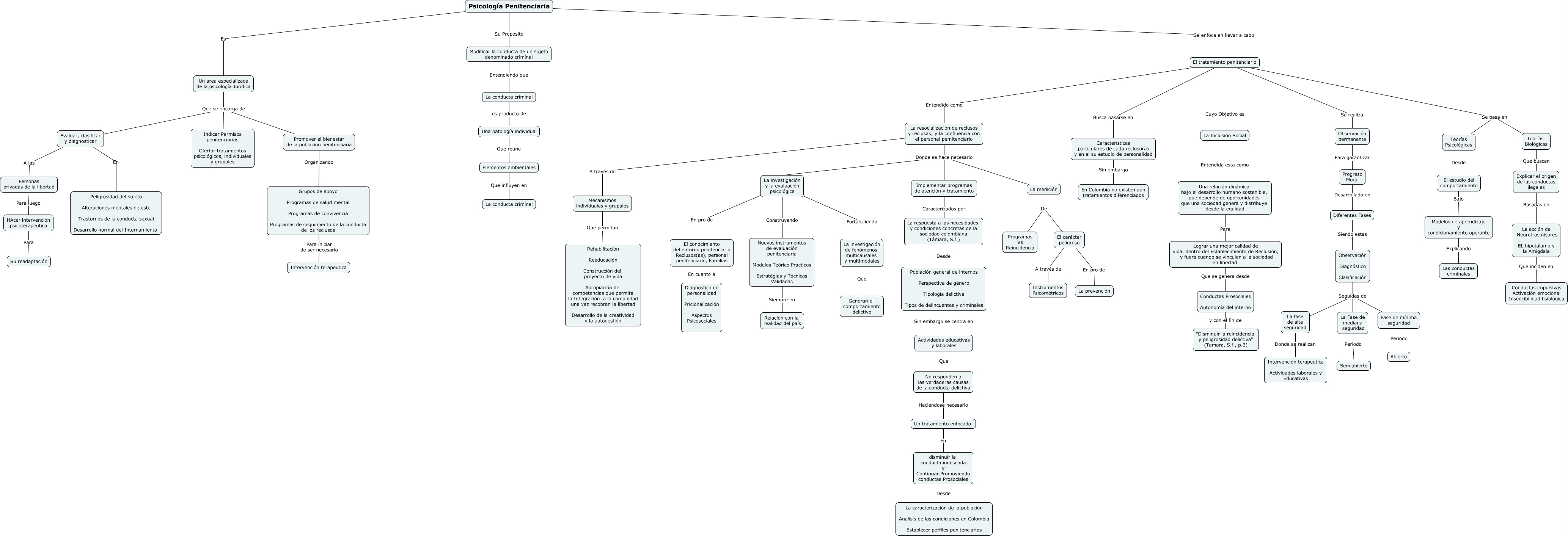 Este Cmap, tiene información relacionada con: Psicología Penitenciaria, Fase de mínima seguridad Periodo Abierto, El conocimiento del entorno penitenciario Reclusos(as), personal penitenciario, Familias En cuanto a Diagnostico de personalidad Pricionalización Aspectos Psicosociales, La medición De El carácter peligroso, Características particulares de cada recluso(a) y en el su estudio de personalidad Sin embargo En Colombia no existen aún tratamientos diferenciados, Evaluar, clasificar y diagnosticar En Peligrosidad del sujeto Alteraciones mentales de este Trastornos de la conducta sexual Desarrollo normal del Internamiento, El tratamiento penitenciario Entendido como La resocialización de reclusos y reclusas; y la confluencia con el personal pemitenciario, Actividades educativas y laborales Que No responden a las verdaderas causas de la conducta delictiva, Un área especializada de la psicología Jurídica Que se encarga de Indicar Permisos penitenciarios Ofertar tratamientos psicológicos, individuales y grupales, Mecanismos individuales y grupales Que permitan Rehabilitación Reeducación Construcción del proyecto de vida Apropiación de competencias que permita la Integración a la comunidad una vez recobran la libertad Desarrollo de la creatividad y la autogestión, Un área especializada de la psicología Jurídica Que se encarga de Evaluar, clasificar y diagnosticar, Psicología Penitenciaria Se enfoca en llevar a cabo El tratamiento penitenciario, El tratamiento penitenciario Se realiza Observación permanente, La Inclusión Social Entendida esta como Una relación dinámica bajo el desarrollo humano sostenible, que depende de oportunidades que una sociedad genera y distribuye desde la equidad, Un área especializada de la psicología Jurídica Que se encarga de Promover el bienestar de la población penitenciaria, El carácter peligroso En pro de La prevención, Una patología individual Que reune Elementos ambientales, No responden a las verdaderas causas de la conducta delictiva Haciéndose necesario Un tratamiento enfocado, Teorías Psicológicas Desde El estudio del comportamiento, HAcer intervención psicoterapeutica Para Su readaptación, La investigación y la evaluación psicológica Construyendo Nuevos instrumentos de evaluación penitenciaria Modelos Teórico Prácticos Estratégias y Técnicas Validadas