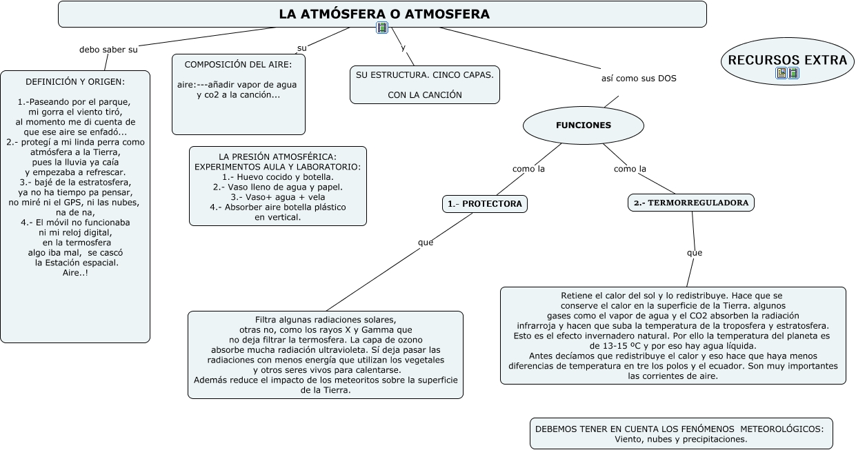 Este Cmap, tiene información relacionada con: LA ATMÓSFERA, 1.- PROTECTORA que Filtra algunas radiaciones solares, otras no, como los rayos X y Gamma que no deja filtrar la termosfera. La capa de ozono absorbe mucha radiación ultravioleta. Sí deja pasar las radiaciones con menos energía que utilizan los vegetales y otros seres vivos para calentarse. Además reduce el impacto de los meteoritos sobre la superficie de la Tierra., FUNCIONES como la 1.- PROTECTORA, LA ATMÓSFERA O ATMOSFERA debo saber su DEFINICIÓN Y ORIGEN: 1.-Paseando por el parque, mi gorra el viento tiró, al momento me di cuenta de que ese aire se enfadó... 2.- protegí a mi linda perra como atmósfera a la Tierra, pues la lluvia ya caía y empezaba a refrescar. 3.- bajé de la estratosfera, ya no ha tiempo pa pensar, no miré ni el GPS, ni las nubes, na de na, 4.- El móvil no funcionaba ni mi reloj digital, en la termosfera algo iba mal, se cascó la Estación espacial. Aire..!, LA ATMÓSFERA O ATMOSFERA y SU ESTRUCTURA. CINCO CAPAS. CON LA CANCIÓN, LA ATMÓSFERA O ATMOSFERA su COMPOSICIÓN DEL AIRE: aire:---añadir vapor de agua y co2 a la canción..., FUNCIONES como la 2.- TERMORREGULADORA, 2.- TERMORREGULADORA que Retiene el calor del sol y lo redistribuye. Hace que se conserve el calor en la superficie de la Tierra. algunos gases como el vapor de agua y el CO2 absorben la radiación infrarroja y hacen que suba la temperatura de la troposfera y estratosfera. Esto es el efecto invernadero natural. Por ello la temperatura del planeta es de 13-15 ºC y por eso hay agua líquida. Antes decíamos que redistribuye el calor y eso hace que haya menos diferencias de temperatura en tre los polos y el ecuador. Son muy importantes las corrientes de aire., LA ATMÓSFERA O ATMOSFERA así como sus DOS FUNCIONES