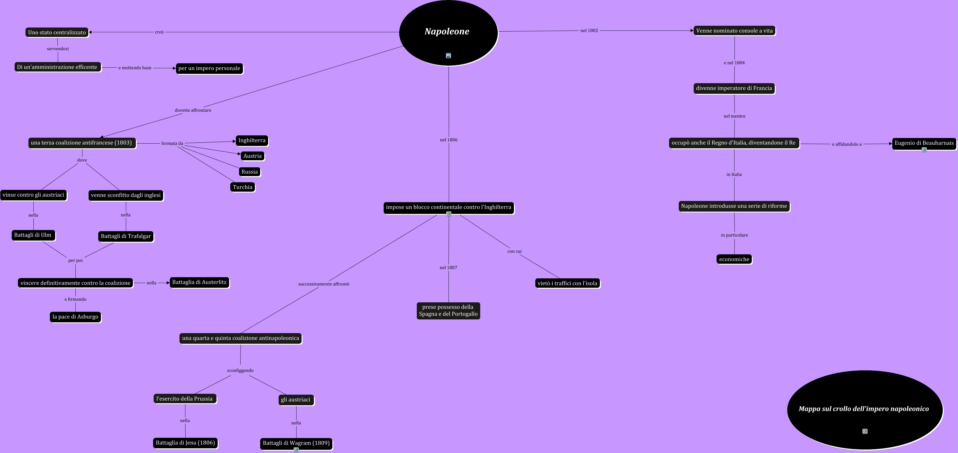 Questa Cmap, creata con IHMC CmapTools, contiene informazioni relative a: Prima mappa Napoleone, una terza coalizione antifrancese (1803) dove vinse contro gli austriaci, una quarta e quinta coalizione antinapoleonica sconfiggendo l'esercito della Prussia, Battagli di Trafalgar per poi vincere definitivamente contro la coalizione, occupò anche il Regno d'Italia, diventandone il Re e affidandolo a Eugenio di Beauharnais, una terza coalizione antifrancese (1803) formata da Austria, divenne imperatore di Francia nel mentre occupò anche il Regno d'Italia, diventandone il Re, Di un'amministrazione efficente e mettendo base per un impero personale, Venne nominato console a vita e nel 1804 divenne imperatore di Francia, venne sconfitto dagli inglesi nella Battagli di Trafalgar, impose un blocco continentale contro l'Inghilterra nel 1807 prese possesso della Spagna e del Portogallo, una terza coalizione antifrancese (1803) formata da Turchia, impose un blocco continentale contro l'Inghilterra con cui vietò i traffici con l'isola, vincere definitivamente contro la coalizione nella Battaglia di Austerlitz, Napoleone dovette affrontare una terza coalizione antifrancese (1803), impose un blocco continentale contro l'Inghilterra successivamente affrontò una quarta e quinta coalizione antinapoleonica, una quarta e quinta coalizione antinapoleonica sconfiggendo gli austriaci, Napoleone nel 1806 impose un blocco continentale contro l'Inghilterra, una terza coalizione antifrancese (1803) dove venne sconfitto dagli inglesi, Napoleone nel 1802 Venne nominato console a vita, vincere definitivamente contro la coalizione e firmando la pace di Asburgo