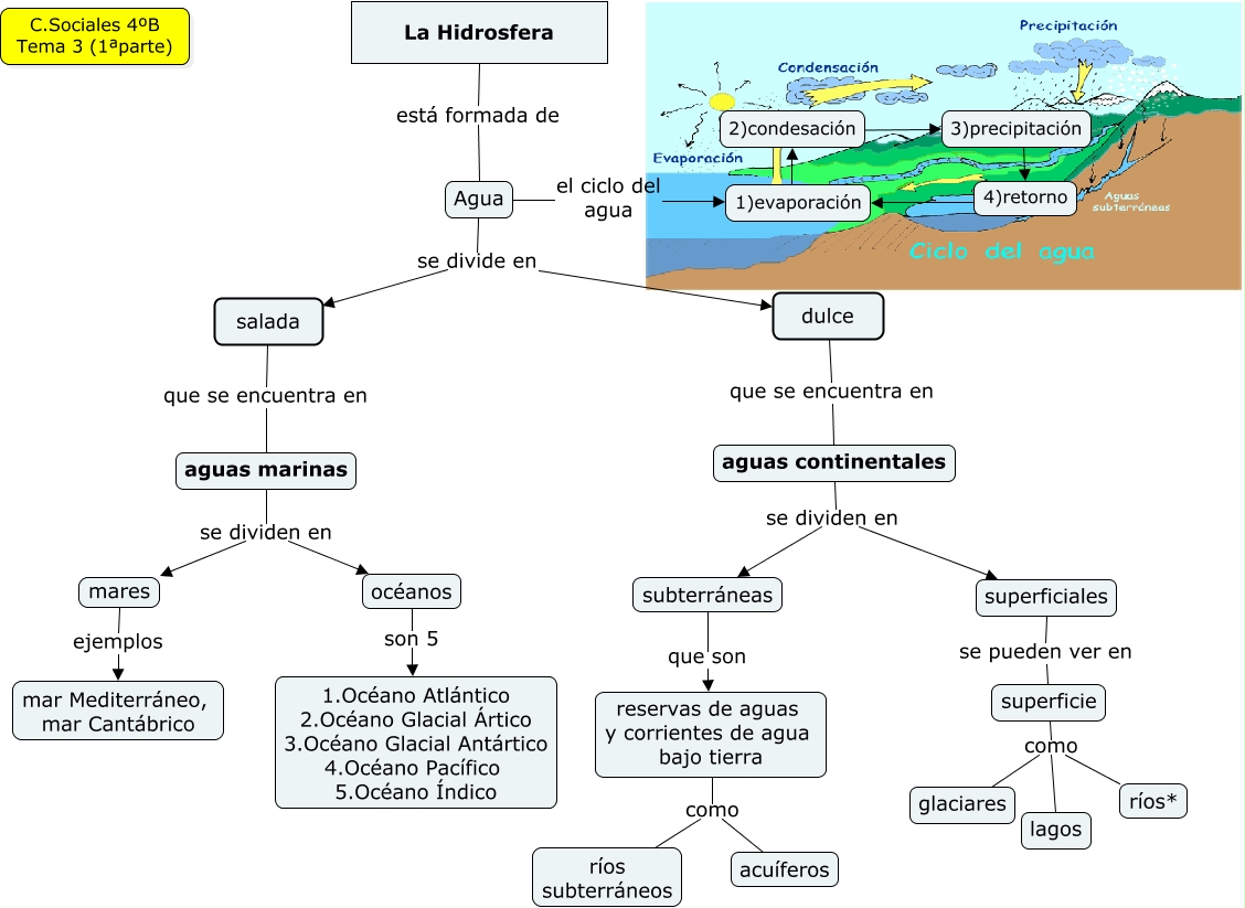 Este Cmap, tiene información relacionada con: Senza titolo 1, superficiales se pueden ver en superficie, reservas de aguas y corrientes de agua bajo tierra como acuíferos, aguas continentales se dividen en subterráneas, reservas de aguas y corrientes de agua bajo tierra como ríos subterráneos, salada que se encuentra en aguas marinas, océanos son 5 1.Océano Atlántico 2.Océano Glacial Ártico 3.Océano Glacial Antártico 4.Océano Pacífico 5.Océano Índico, superficie como glaciares, aguas marinas se dividen en océanos, 2)condesación ???? 3)precipitación, mares ejemplos mar Mediterráneo, mar Cantábrico, Agua se divide en salada, 4)retorno ???? 1)evaporación, aguas continentales se dividen en superficiales, superficie como ríos*, subterráneas que son reservas de aguas y corrientes de agua bajo tierra, Agua el ciclo del agua 1)evaporación, 3)precipitación ???? 4)retorno, Agua se divide en dulce, La Hidrosfera está formada de Agua, dulce que se encuentra en aguas continentales