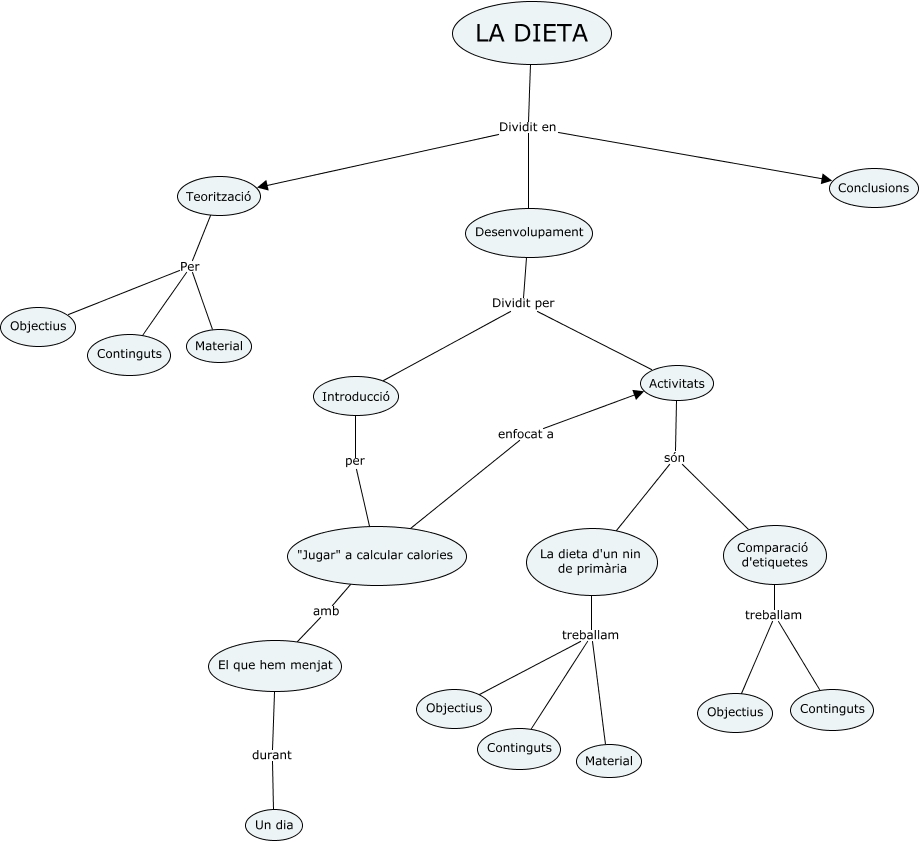 Este Cmap, tiene información relacionada con: Seminari 7, LA DIETA Dividit en Desenvolupament, El que hem menjat durant Un dia, Teorització Per Objectius, Activitats són La dieta d'un nin de primària, La dieta d'un nin de primària treballam Objectius, Activitats són Comparació d'etiquetes, LA DIETA Dividit en Conclusions, La dieta d'un nin de primària treballam Material, Comparació d'etiquetes treballam Objectius, Desenvolupament Dividit per Activitats, "Jugar" a calcular calories enfocat a Activitats, Comparació d'etiquetes treballam Continguts, Desenvolupament Dividit per Introducció, Teorització Per Continguts, Teorització Per Material, Introducció per "Jugar" a calcular calories, La dieta d'un nin de primària treballam Continguts, "Jugar" a calcular calories amb El que hem menjat, LA DIETA Dividit en Teorització