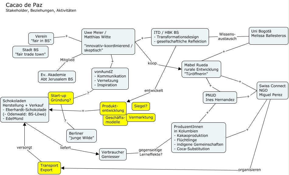 Dieses mit IHMC CmapTools erstellte CMap hat Informationen bezüglich: Cacao_Stakeholder_v1_160331, Verein "fair in BS" + Uwe Meier / Matthias Witte "innovativ-koordinierend / skeptisch", Produkt- entwicklung + Schokoladen Herstellung + Verkauf - Eberhardt-Schokolade (- Odenwald: BS-Löwe) - EdelMond, PNUD Ines Hernandez + ProduzentInnen in Kolumbien - Kakaoproduktion - Flüchtlinge - indigene Gemeinschaften - Coca-Substitution, ITD / HBK BS - Transformationsdesign - gesellschaftliche Reflektion Wissens- austausch Uni Bogotà Melissa Ballesteros, Uwe Meier / Matthias Witte "innovativ-koordinierend / skeptisch" koop. Mabel Rueda rurale Entwicklung "Türöffnerin", Uwe Meier / Matthias Witte "innovativ-koordinierend / skeptisch" Mitglied Ev. Akademie Abt Jerusalem BS, Swiss Connect NGO Miguel Perez organisieren Transport Export, Berliner "junge Wilde" ? Start-up Gründung?, Schokoladen Herstellung + Verkauf - Eberhardt-Schokolade (- Odenwald: BS-Löwe) - EdelMond liefert Verbraucher Geniesser, Uni Bogotà Melissa Ballesteros + Mabel Rueda rurale Entwicklung "Türöffnerin", Mabel Rueda rurale Entwicklung "Türöffnerin" + PNUD Ines Hernandez, ITD / HBK BS - Transformationsdesign - gesellschaftliche Reflektion entwickelt Produkt- entwicklung, Mabel Rueda rurale Entwicklung "Türöffnerin" + Swiss Connect NGO Miguel Perez, Swiss Connect NGO Miguel Perez + ProduzentInnen in Kolumbien - Kakaoproduktion - Flüchtlinge - indigene Gemeinschaften - Coca-Substitution, Transport Export versorgt Schokoladen Herstellung + Verkauf - Eberhardt-Schokolade (- Odenwald: BS-Löwe) - EdelMond, PNUD Ines Hernandez + Swiss Connect NGO Miguel Perez, Uwe Meier / Matthias Witte "innovativ-koordinierend / skeptisch" + vonAundZ - Kommunikation - Vernetzung - Inspiration, vonAundZ - Kommunikation - Vernetzung - Inspiration ? Start-up Gründung?, Uwe Meier / Matthias Witte "innovativ-koordinierend / skeptisch" + ITD / HBK BS - Transformationsdesign - gesellschaftliche Reflektion, Verbraucher Geniesser gegenseitige Lerneffekte? ProduzentInnen in Kolumbien - Kakaoproduktion - Flüchtlinge - indigene Gemeinschaften - Coca-Substitution