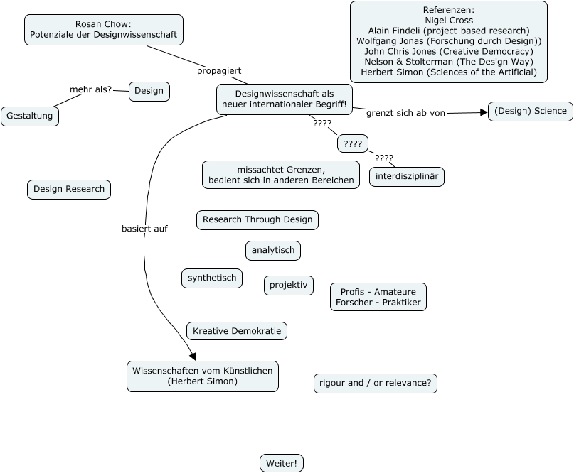Dieses mit IHMC CmapTools erstellte CMap hat Informationen bezüglich: Text Rosan Chow, Design mehr als? Gestaltung, Designwissenschaft als neuer internationaler Begriff! ???? ????, Designwissenschaft als neuer internationaler Begriff! grenzt sich ab von (Design) Science, Rosan Chow: Potenziale der Designwissenschaft propagiert Designwissenschaft als neuer internationaler Begriff!, ???? ???? interdisziplinär, Designwissenschaft als neuer internationaler Begriff! basiert auf Wissenschaften vom Künstlichen (Herbert Simon)