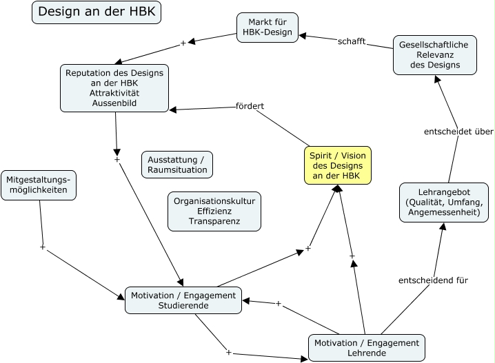 Dieses mit IHMC CmapTools erstellte CMap hat Informationen bezüglich: ID HBK-System, Motivation / Engagement Studierende + Motivation / Engagement Lehrende, Motivation / Engagement Lehrende + Motivation / Engagement Studierende, Lehrangebot (Qualität, Umfang, Angemessenheit) entscheidet über Gesellschaftliche Relevanz des Designs, Mitgestaltungs- möglichkeiten + Motivation / Engagement Studierende, Reputation des Designs an der HBK Attraktivität Aussenbild + Motivation / Engagement Studierende, Motivation / Engagement Studierende + Spirit / Vision des Designs an der HBK, Motivation / Engagement Lehrende + Spirit / Vision des Designs an der HBK, Gesellschaftliche Relevanz des Designs schafft Markt für HBK-Design, Markt für HBK-Design + Reputation des Designs an der HBK Attraktivität Aussenbild, Spirit / Vision des Designs an der HBK fördert Reputation des Designs an der HBK Attraktivität Aussenbild, Motivation / Engagement Lehrende entscheidend für Lehrangebot (Qualität, Umfang, Angemessenheit)