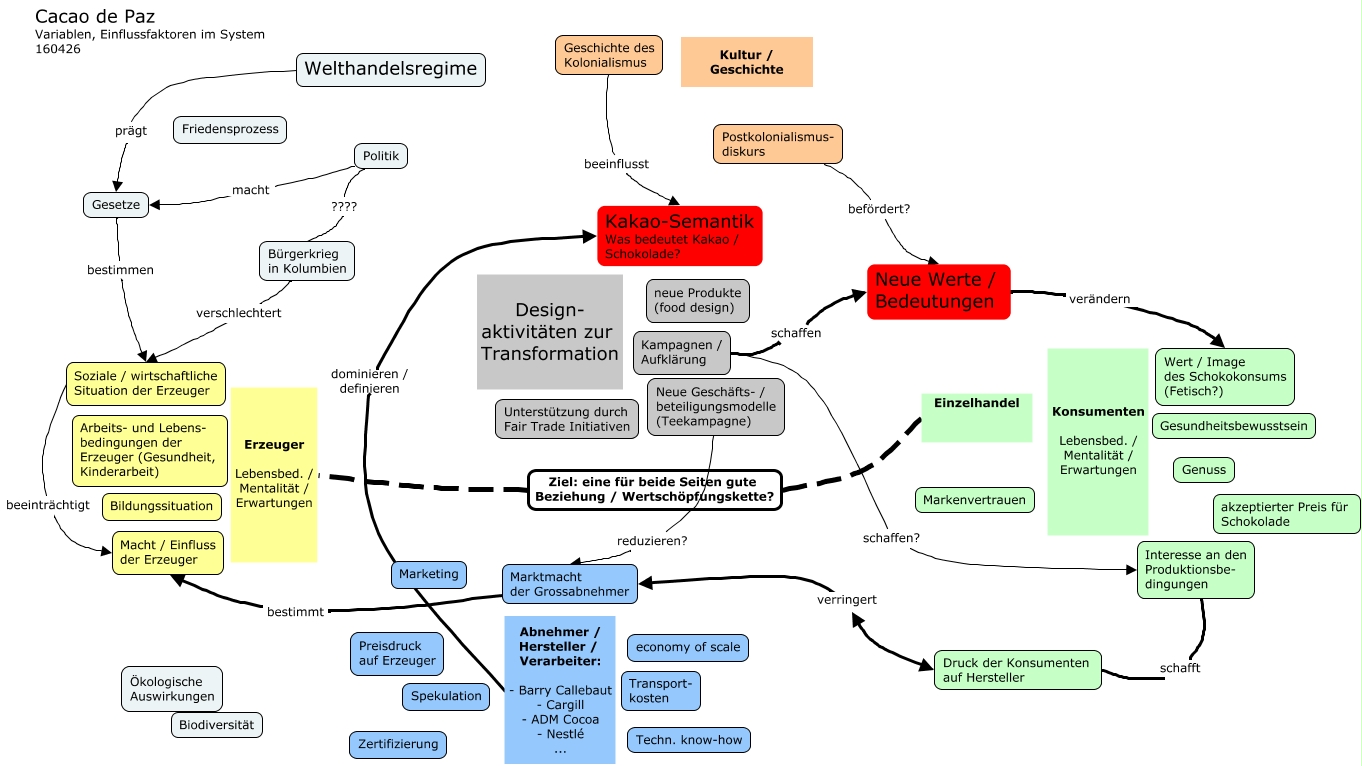 Dieses mit IHMC CmapTools erstellte CMap hat Informationen bezüglich: Map_3_Cacao_Variaben_160423, Interesse an den Produktionsbe- dingungen schafft Druck der Konsumenten auf Hersteller, Marktmacht der Grossabnehmer bestimmt Macht / Einfluss der Erzeuger, Neue Geschäfts- / beteiligungsmodelle (Teekampagne) reduzieren? Marktmacht der Grossabnehmer, Abnehmer / Hersteller / Verarbeiter: - Barry Callebaut - Cargill - ADM Cocoa - Nestlé ... dominieren / definieren Kakao-Semantik Was bedeutet Kakao / Schokolade?, Gesetze bestimmen Soziale / wirtschaftliche Situation der Erzeuger, Politik ???? Bürgerkrieg in Kolumbien, Bürgerkrieg in Kolumbien verschlechtert Soziale / wirtschaftliche Situation der Erzeuger, Postkolonialismus- diskurs befördert? Neue Werte / Bedeutungen, Druck der Konsumenten auf Hersteller verringert Marktmacht der Grossabnehmer, Kampagnen / Aufklärung schaffen? Interesse an den Produktionsbe- dingungen, Neue Werte / Bedeutungen verändern Wert / Image des Schokokonsums (Fetisch?), Kampagnen / Aufklärung schaffen Neue Werte / Bedeutungen, Welthandelsregime prägt Gesetze, Geschichte des Kolonialismus beeinflusst Kakao-Semantik Was bedeutet Kakao / Schokolade?, Politik macht Gesetze, Soziale / wirtschaftliche Situation der Erzeuger beeinträchtigt Macht / Einfluss der Erzeuger