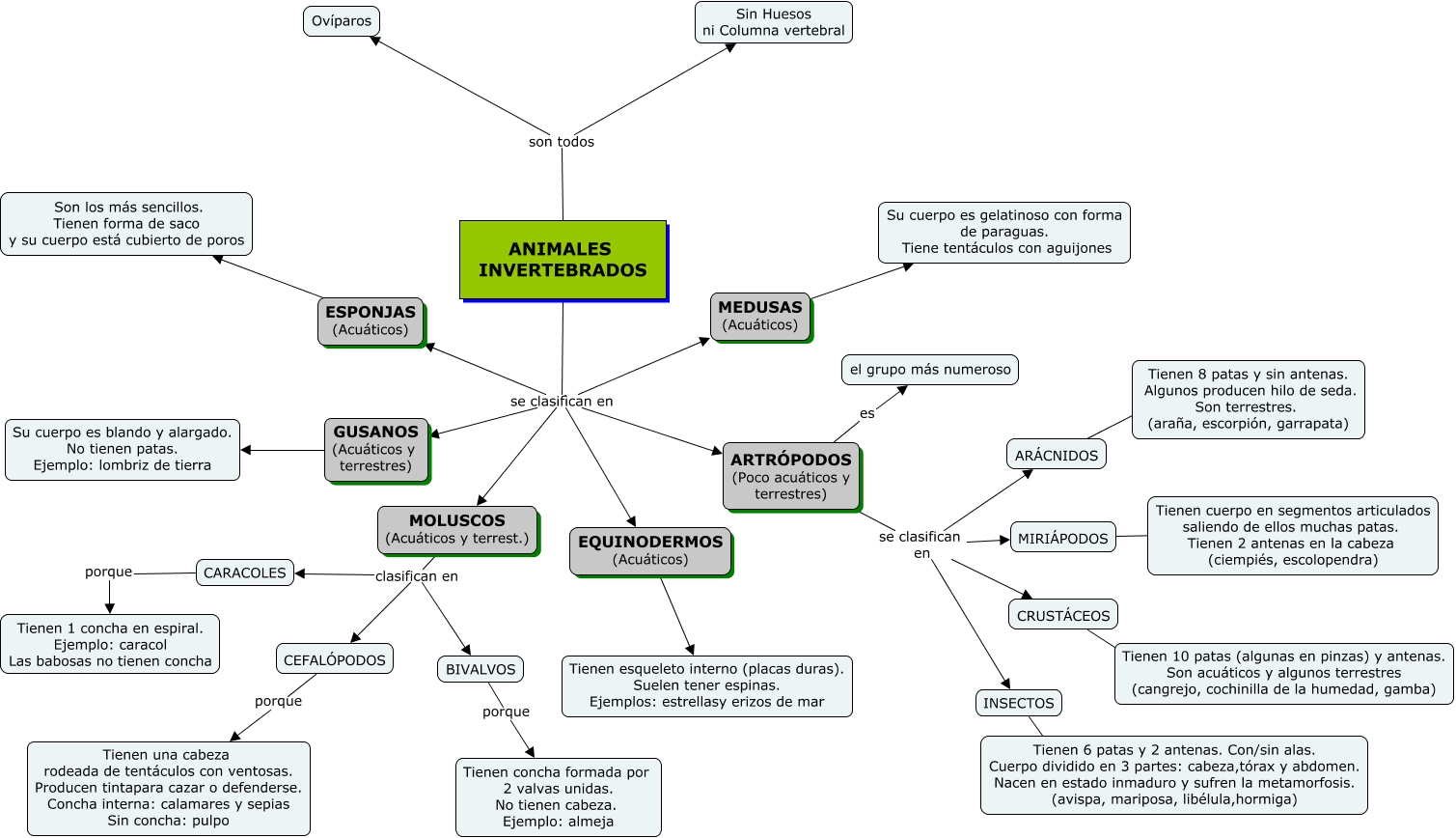 Este Cmap, tiene información relacionada con: Invertebrados T4 santillana, ANIMALES INVERTEBRADOS se clasifìcan en EQUINODERMOS (Acuáticos), ARTRÓPODOS (Poco acuáticos y terrestres) es el grupo más numeroso, MOLUSCOS (Acuáticos y terrest.) clasifican en CEFALÓPODOS, ANIMALES INVERTEBRADOS se clasifìcan en ESPONJAS (Acuáticos), ANIMALES INVERTEBRADOS se clasifìcan en ARTRÓPODOS (Poco acuáticos y terrestres), ANIMALES INVERTEBRADOS se clasifìcan en MEDUSAS (Acuáticos), CRUSTÁCEOS porque Tienen 10 patas (algunas en pinzas) y antenas. Son acuáticos y algunos terrestres (cangrejo, cochinilla de la humedad, gamba), ANIMALES INVERTEBRADOS se clasifìcan en MOLUSCOS (Acuáticos y terrest.), ARÁCNIDOS porque Tienen 8 patas y sin antenas. Algunos producen hilo de seda. Son terrestres. (araña, escorpión, garrapata), GUSANOS (Acuáticos y terrestres) ???? Su cuerpo es blando y alargado. No tienen patas. Ejemplo: lombriz de tierra, EQUINODERMOS (Acuáticos) ???? Tienen esqueleto interno (placas duras). Suelen tener espinas. Ejemplos: estrellasy erizos de mar, MIRIÁPODOS porque Tienen cuerpo en segmentos articulados saliendo de ellos muchas patas. Tienen 2 antenas en la cabeza (ciempiés, escolopendra), BIVALVOS porque Tienen concha formada por 2 valvas unidas. No tienen cabeza. Ejemplo: almeja, ARTRÓPODOS (Poco acuáticos y terrestres) se clasifican en MIRIÁPODOS, ANIMALES INVERTEBRADOS son todos Ovíparos, ESPONJAS (Acuáticos) ???? Son los más sencillos. Tienen forma de saco y su cuerpo está cubierto de poros, CEFALÓPODOS porque Tienen una cabeza rodeada de tentáculos con ventosas. Producen tintapara cazar o defenderse. Concha interna: calamares y sepias Sin concha: pulpo, MOLUSCOS (Acuáticos y terrest.) clasifican en BIVALVOS, CARACOLES porque Tienen 1 concha en espiral. Ejemplo: caracol Las babosas no tienen concha, INSECTOS porque Tienen 6 patas y 2 antenas. Con/sin alas. Cuerpo dividido en 3 partes: cabeza,tórax y abdomen. Nacen en estado inmaduro y sufren la metamorfosis. (avispa, mariposa, libélula,hormiga)
