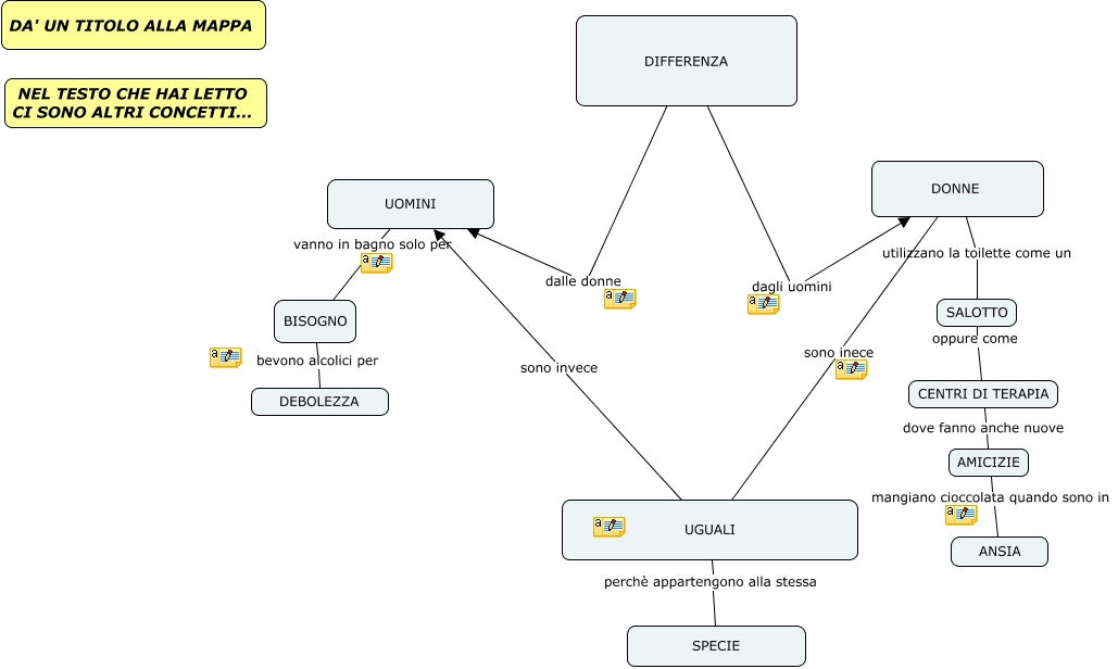 Questa Cmap, creata con IHMC CmapTools, contiene informazioni relative a: Senza titolo 2, AMICIZIE mangiano cioccolata quando sono in ANSIA, BISOGNO bevono alcolici per DEBOLEZZA, DONNE utilizzano la toilette come un SALOTTO, UGUALI perchè appartengono alla stessa SPECIE, UGUALI sono invece UOMINI, UOMINI vanno in bagno solo per BISOGNO, DIFFERENZA dalle donne UOMINI, CENTRI DI TERAPIA dove fanno anche nuove AMICIZIE, SALOTTO oppure come CENTRI DI TERAPIA, DIFFERENZA dagli uomini DONNE, DONNE sono inece UGUALI