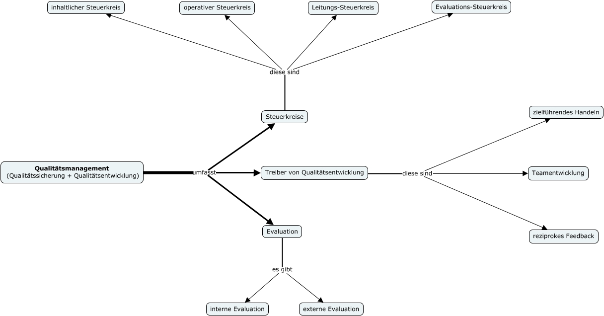 Dieses mit IHMC CmapTools erstellte CMap hat Informationen bezüglich: Rolff2007_b1.1, Steuerkreise diese sind Leitungs-Steuerkreis, Treiber von Qualitätsentwicklung diese sind reziprokes Feedback, Qualitätsmanagement (Qualitätssicherung + Qualitätsentwicklung) umfasst Steuerkreise, Steuerkreise diese sind Evaluations-Steuerkreis, Qualitätsmanagement (Qualitätssicherung + Qualitätsentwicklung) umfasst Evaluation, Treiber von Qualitätsentwicklung diese sind zielführendes Handeln, Treiber von Qualitätsentwicklung diese sind Teamentwicklung, Evaluation es gibt externe Evaluation, Steuerkreise diese sind operativer Steuerkreis, Steuerkreise diese sind inhaltlicher Steuerkreis, Evaluation es gibt interne Evaluation, Qualitätsmanagement (Qualitätssicherung + Qualitätsentwicklung) umfasst Treiber von Qualitätsentwicklung