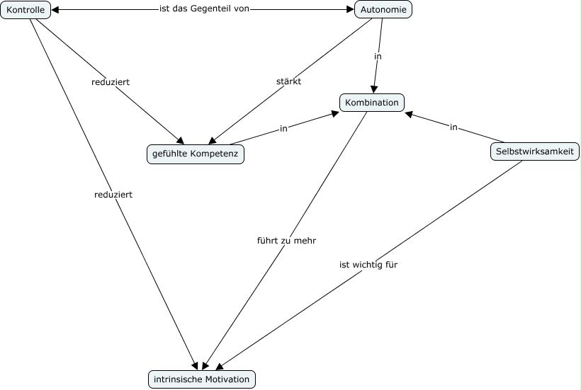 Dieses mit IHMC CmapTools erstellte CMap hat Informationen bezüglich: Deci&Ryan1993_b1, Kombination führt zu mehr intrinsische Motivation, gefühlte Kompetenz in Kombination, Kontrolle reduziert gefühlte Kompetenz, Autonomie stärkt gefühlte Kompetenz, Kontrolle reduziert intrinsische Motivation, Selbstwirksamkeit in Kombination, Autonomie in Kombination, Selbstwirksamkeit ist wichtig für intrinsische Motivation