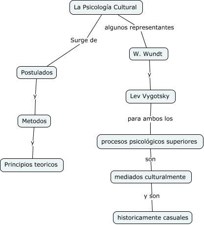 Este Cmap, tiene información relacionada con: PSICOLOGIA CULTURAL, La Psicología Cultural algunos representantes W. Wundt, La Psicología Cultural Surge de Postulados, W. Wundt y Lev Vygotsky, Lev Vygotsky para ambos los procesos psicológicos superiores, mediados culturalmente y son historicamente casuales, Metodos y Principios teoricos, Postulados y Metodos, procesos psicológicos superiores son mediados culturalmente