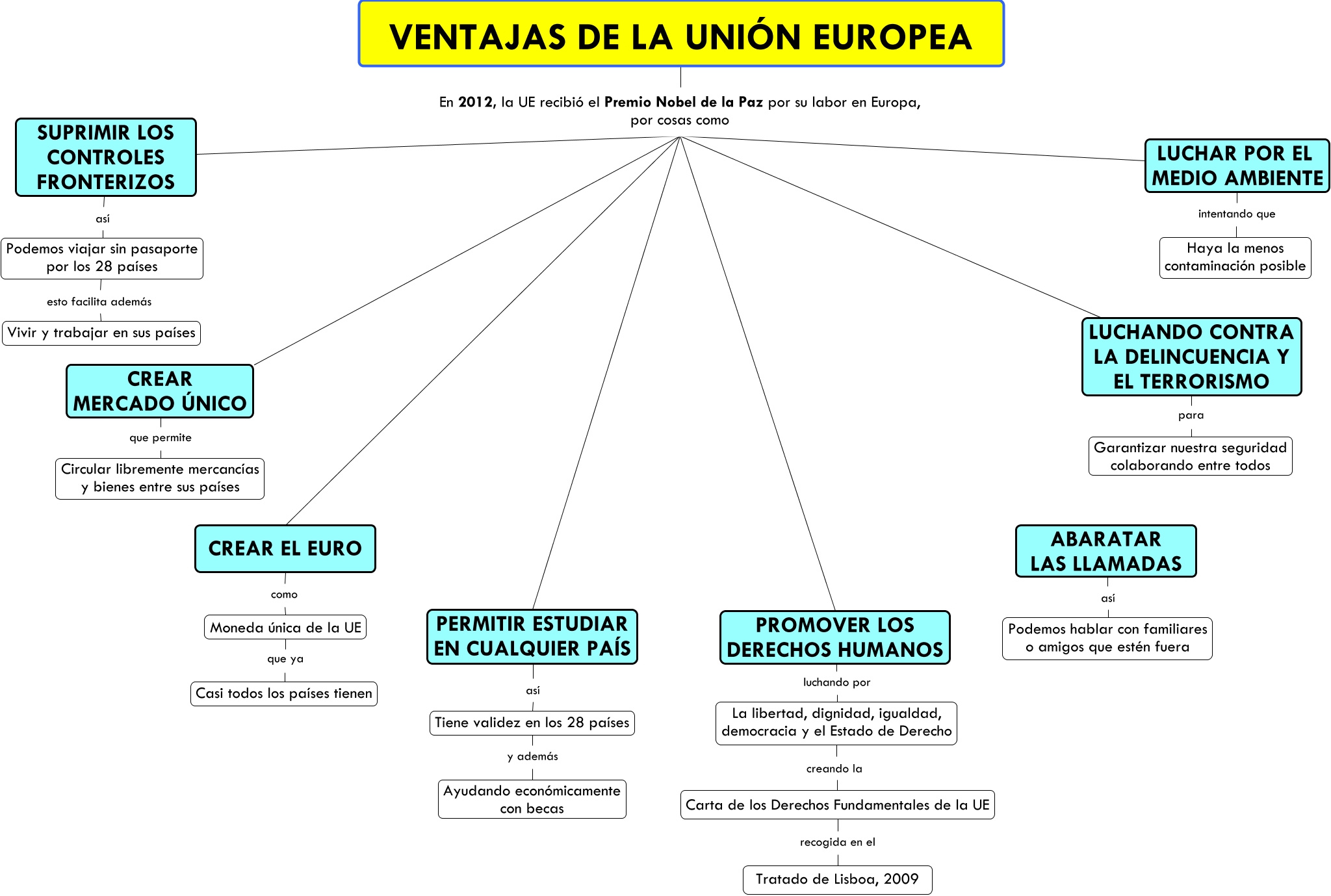 Este Cmap, tiene información relacionada con: VENTAJAS DE LA UNIÓN EUROPEA, LUCHANDO CONTRA LA DELINCUENCIA Y EL TERRORISMO En 2012, la UE recibió el Premio Nobel de la Paz por su labor en Europa, por cosas como CREAR EL EURO, Tiene validez en los 28 países y además Ayudando económicamente con becas, LUCHAR POR EL MEDIO AMBIENTE En 2012, la UE recibió el Premio Nobel de la Paz por su labor en Europa, por cosas como PROMOVER LOS DERECHOS HUMANOS, VENTAJAS DE LA UNIÓN EUROPEA En 2012, la UE recibió el Premio Nobel de la Paz por su labor en Europa, por cosas como PERMITIR ESTUDIAR EN CUALQUIER PAÍS, LUCHANDO CONTRA LA DELINCUENCIA Y EL TERRORISMO En 2012, la UE recibió el Premio Nobel de la Paz por su labor en Europa, por cosas como CREAR MERCADO ÚNICO, LUCHAR POR EL MEDIO AMBIENTE En 2012, la UE recibió el Premio Nobel de la Paz por su labor en Europa, por cosas como SUPRIMIR LOS CONTROLES FRONTERIZOS, Moneda única de la UE que ya Casi todos los países tienen, Carta de los Derechos Fundamentales de la UE recogida en el Tratado de Lisboa, 2009, LUCHAR POR EL MEDIO AMBIENTE En 2012, la UE recibió el Premio Nobel de la Paz por su labor en Europa, por cosas como CREAR MERCADO ÚNICO, ABARATAR LAS LLAMADAS así Podemos hablar con familiares o amigos que estén fuera, CREAR MERCADO ÚNICO que permite Circular libremente mercancías y bienes entre sus países, LUCHAR POR EL MEDIO AMBIENTE En 2012, la UE recibió el Premio Nobel de la Paz por su labor en Europa, por cosas como PERMITIR ESTUDIAR EN CUALQUIER PAÍS, LUCHANDO CONTRA LA DELINCUENCIA Y EL TERRORISMO En 2012, la UE recibió el Premio Nobel de la Paz por su labor en Europa, por cosas como PERMITIR ESTUDIAR EN CUALQUIER PAÍS, CREAR EL EURO como Moneda única de la UE, SUPRIMIR LOS CONTROLES FRONTERIZOS así Podemos viajar sin pasaporte por los 28 países, LUCHANDO CONTRA LA DELINCUENCIA Y EL TERRORISMO En 2012, la UE recibió el Premio Nobel de la Paz por su labor en Europa, por cosas como SUPRIMIR LOS CONTROLES FRONTERIZOS, VENTAJAS DE LA UNIÓN EUROPEA En 2012, la UE recibió el Premio Nobel de la Paz por su labor en Europa, por cosas como SUPRIMIR LOS CONTROLES FRONTERIZOS, LUCHAR POR EL MEDIO AMBIENTE En 2012, la UE recibió el Premio Nobel de la Paz por su labor en Europa, por cosas como CREAR EL EURO, VENTAJAS DE LA UNIÓN EUROPEA En 2012, la UE recibió el Premio Nobel de la Paz por su labor en Europa, por cosas como CREAR EL EURO, La libertad, dignidad, igualdad, democracia y el Estado de Derecho creando la Carta de los Derechos Fundamentales de la UE