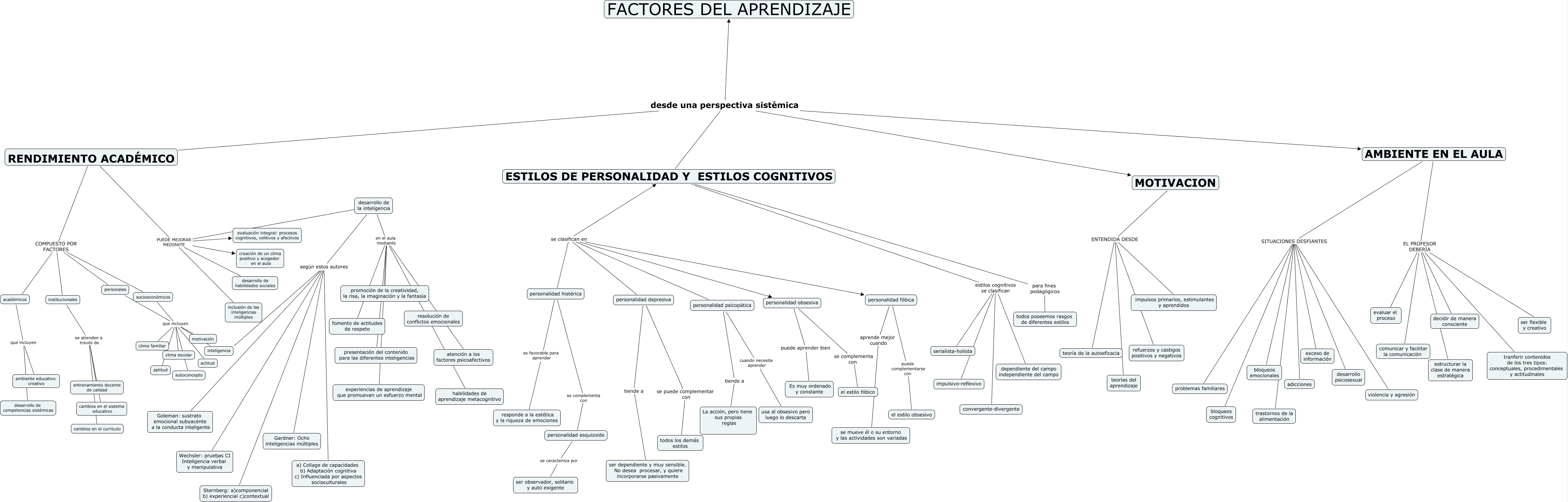 Este Cmap, tiene información relacionada con: Copia de FACTORES DE APRENDIZAJE 4 A, AMBIENTE EN EL AULA EL PROFESOR DEBERÍA comunicar y facilitar la comunicación, RENDIMIENTO ACADÉMICO desde una perspectiva sistémica ESTILOS DE PERSONALIDAD Y ESTILOS COGNITIVOS, personalidad histérica se clasifican en personalidad depresiva, RENDIMIENTO ACADÉMICO PUEDE MEJORAR MEDIANTE evaluación integral: procesos cognitivos, volitivos y afectivos, personalidad obsesiva se complementa con el estilo fóbico, personalidad histérica se clasifican en ESTILOS DE PERSONALIDAD Y ESTILOS COGNITIVOS, ESTILOS DE PERSONALIDAD Y ESTILOS COGNITIVOS para fines pedagógicos todos poseemos rasgos de diferentes estilos, ESTILOS DE PERSONALIDAD Y ESTILOS COGNITIVOS estilos cognitivos se clasifican dependiente del campo independiente del campo, desarrollo de la inteligencia PUEDE MEJORAR MEDIANTE inclusión de las inteligencias múltiples, desarrollo de la inteligencia según estos autores Goleman: sustrato emocional subyacente a la conducta inteligente, desarrollo de la inteligencia según estos autores a) Collage de capacidades b) Adaptación cognitiva c) Influenciada por aspectos socioculturales, RENDIMIENTO ACADÉMICO PUEDE MEJORAR MEDIANTE desarrollo de habilidades sociales, RENDIMIENTO ACADÉMICO desde una perspectiva sistémica AMBIENTE EN EL AULA, socioeconómicos que incluyen inteligencia, desarrollo de la inteligencia en el aula mediante presentación del contenido para las diferentes inteligencias, RENDIMIENTO ACADÉMICO PUEDE MEJORAR MEDIANTE creación de un clima positivo y acogedor en el aula, desarrollo de la inteligencia según estos autores Wechsler: pruebas CI Inteligencia verbal y manipulativa, desarrollo de la inteligencia según estos autores inteligencia, desarrollo de la inteligencia en el aula mediante atención a los factores psicoafectivos, AMBIENTE EN EL AULA EL PROFESOR DEBERÍA estructurar la clase de manera estratégica