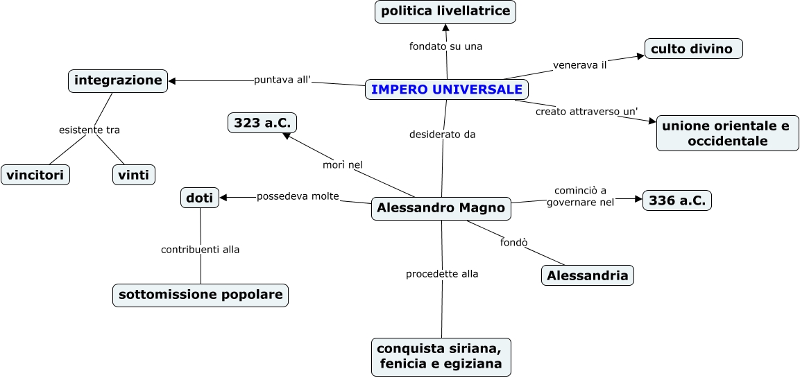 Questa Cmap, creata con IHMC CmapTools, contiene informazioni relative a: ELFA 1C, IMPERO UNIVERSALE desiderato da Alessandro Magno, doti contribuenti alla sottomissione popolare, Alessandro Magno morì nel 323 a.C., IMPERO UNIVERSALE puntava all' integrazione, integrazione esistente tra vinti, IMPERO UNIVERSALE fondato su una politica livellatrice, IMPERO UNIVERSALE venerava il culto divino, Alessandro Magno fondò Alessandria, Alessandro Magno cominciò a governare nel 336 a.C., IMPERO UNIVERSALE creato attraverso un' unione orientale e occidentale, Alessandro Magno possedeva molte doti, Alessandro Magno procedette alla conquista siriana, fenicia e egiziana, integrazione esistente tra vincitori