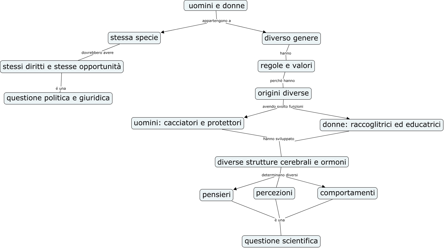 Questa Cmap, creata con IHMC CmapTools, contiene informazioni relative a: gruppo 7, stessa specie dovrebbero avere stessi diritti e stesse opportunità, regole e valori perchè hanno origini diverse, diverse strutture cerebrali e ormoni determinano diversi percezioni, diverse strutture cerebrali e ormoni determinano diversi comportamenti, pensieri è una questione scientifica, comportamenti è una questione scientifica, diverse strutture cerebrali e ormoni determinano diversi pensieri, uomini e donne appartengono a diverso genere, diverso genere hanno regole e valori, donne: raccoglitrici ed educatrici hanno sviluppato diverse strutture cerebrali e ormoni, uomini e donne appartengono a stessa specie, uomini: cacciatori e protettori hanno sviluppato diverse strutture cerebrali e ormoni, percezioni è una questione scientifica, origini diverse avendo svolto funzioni donne: raccoglitrici ed educatrici, origini diverse avendo svolto funzioni uomini: cacciatori e protettori, stessi diritti e stesse opportunità é una questione politica e giuridica