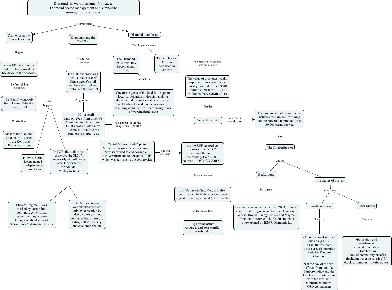 Este Cmap, tiene información relacionada con: LOGICA DE PROGRAMACION, Diamonds and the Civil War What was the cause the diamond trade was not a direct cause of Sierra Leone’s civil war but catalyzed and prolonged the conflict, Since 1930 the diamond industry has formed the backbone of the economy the first mining contract to De Beers’ Monopoly Sierra Leone Selection Trust (SLST, The government of Sierra Leone believes that kimberlite mining has the potential to produce up to 450,000 carats per year Riot The Kimberlite riot, Ousted Momoh, and Captain Valentine Strasser came into power. Strasser vowed to end corruption in government and to defeat the RUF, which was terrorizing the countryside The war continues As the RUF stepped up its attacks, the NPRC increased the size of the military from 3,000 to over 13,000 (ICG 2001b)., As the RUF stepped up its attacks, the NPRC increased the size of the military from 3,000 to over 13,000 (ICG 2001b). Peace agreement In 1996, in Abidjan, Côte d’Ivoire, the RUF and the Kabbah government signed a peace agreement (Gberie 2002), The Diamond area community Development Fund Consists in One of the goals of the fund is to support local participation in decision making about natural resources and development, and to thereby address the grievances of mining communities—particularly those of marginalized youth, the diamond trade was not a direct cause of Sierra Leone’s civil war but catalyzed and prolonged the conflict As generated In 1991, a small band of rebels from Liberia’s Revolutionary United Front (RUF) crossed into Sierra Leone and attacked the southeastern provinces., The Kimberlite riot Causes The causes of the riot, Root causes They are • Relocation and resettlement. • Forced evacuation before blasting • Lack of community benefits (including revenue sharing).36 • Lack of community participation., In 1955, the authorities dissolved the SLST’s monopoly the following year, they enacted the Alluvial Mining Scheme Rulers Stevens’ regime— was marked by corruption, poor management, and economic stagnation— brought on the decline of Sierra Leone’s diamond industry, The Kimberley Process certification scheme the certification scheme was put in place The value of diamonds legally exported from Sierra Leone has skyrocketed from US$10 million in 2000 to US$142 million in 2007 (MMR 2010)., De Beers’ Monopoly Sierra Leone Selection Trust (SLST Production Most of the diamond production occurred in the Kono and Kenema districts, The causes of the riot True causes Immediate causes, Diamonds in the Prewar Economy Begins Since 1930 the diamond industry has formed the backbone of the economy, Background Participans Originally created in September 2003,through a joint venture agreement between Diamond Works, Branch Energy Ltd.,29 and Magma Diamond Resource Ltd., Koidu Holdings is now owned by BSGR Diamonds Ltd, The value of diamonds legally exported from Sierra Leone has skyrocketed from US$10 million in 2000 to US$142 million in 2007 (MMR 2010). Gender Kimberlite mining, Diamonds in war, diamonds for peace: Diamond sector management and kimberlite mining in Sierra Leone Determination Diamonds and the Civil War, ???? what happened In 1955, the authorities dissolved the SLST’s monopoly the following year, they enacted the Alluvial Mining Scheme, Diamonds in war, diamonds for peace: Diamond sector management and kimberlite mining in Sierra Leone Determination Diamonds in the Prewar Economy, The Kimberlite riot Causes Background