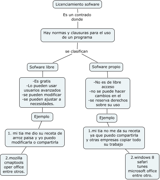 Este Cmap, tiene información relacionada con: Licenciamiento de sotware, Ejemplo ???? 1.mi tia no me da su receta ya que puedo compartirla y otras empresas copiar todo su trabajo, Licenciamiento sofware Es un contrado donde Hay normas y clausuras para el uso de un programa, Ejemplo ???? 1. mi tia me dio su receta de arroz paisa y yo puedo modificarla o compartirla, Sofware libre ???? -Es gratis -Lo pueden usar usuarios avanzados -se pueden modificar -se pueden ajustar a necesidades., Sofware propio ???? -No es de libre acceso -no se puede hacer cambios en el -se reserva derechos sobre su uso, -No es de libre acceso -no se puede hacer cambios en el -se reserva derechos sobre su uso ???? Ejemplo, Hay normas y clausuras para el uso de un programa se clasifican Sofware libre, -Es gratis -Lo pueden usar usuarios avanzados -se pueden modificar -se pueden ajustar a necesidades. ???? Ejemplo, 1. mi tia me dio su receta de arroz paisa y yo puedo modificarla o compartirla ???? 2.mozilla cmaptools oper office entre otros., Hay normas y clausuras para el uso de un programa se clasifican Sofware propio, 1.mi tia no me da su receta ya que puedo compartirla y otras empresas copiar todo su trabajo ???? 2.windows 8 safari tunes microsoft office entre otro.