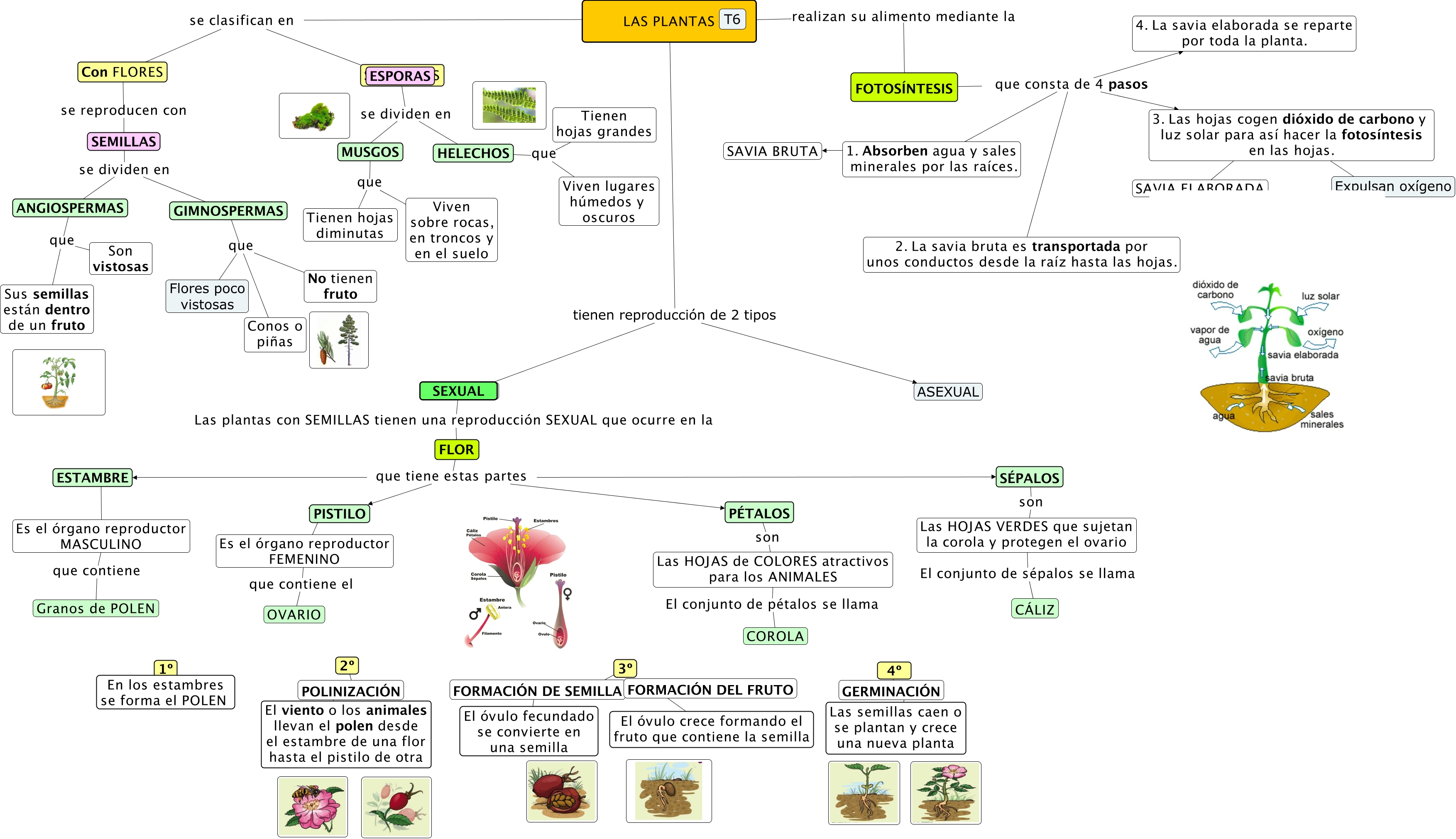 Este Cmap, tiene información relacionada con: Plantas-clases, nutrición y reproducción, PÉTALOS son Las HOJAS de COLORES atractivos para los ANIMALES, FLOR que tiene estas partes PÉTALOS, POLINIZACIÓN ???? El viento o los animales llevan el polen desde el estambre de una flor hasta el pistilo de otra, GERMINACIÓN ???? Las semillas caen o se plantan y crece una nueva planta, GIMNOSPERMAS que Conos o piñas, SEXUAL Las plantas con SEMILLAS tienen una reproducción SEXUAL que ocurre en la FLOR, Es el órgano reproductor FEMENINO que contiene el OVARIO, SÉPALOS son Las HOJAS VERDES que sujetan la corola y protegen el ovario, ANGIOSPERMAS que Sus semillas están dentro de un fruto, FLOR que tiene estas partes PISTILO, ESTAMBRE ???? Es el órgano reproductor MASCULINO, FOTOSÍNTESIS que consta de 4 pasos 1. Absorben agua y sales minerales por las raíces., LAS PLANTAS tienen reproducción de 2 tipos ASEXUAL, T6 se clasifican en Sin FLORES, GIMNOSPERMAS que Flores poco vistosas, HELECHOS que Viven lugares húmedos y oscuros, 1. Absorben agua y sales minerales por las raíces. ???? SAVIA BRUTA, MUSGOS que Viven sobre rocas, en troncos y en el suelo, Las HOJAS VERDES que sujetan la corola y protegen el ovario El conjunto de sépalos se llama CÁLIZ, 3º ???? FORMACIÓN DE SEMILLA