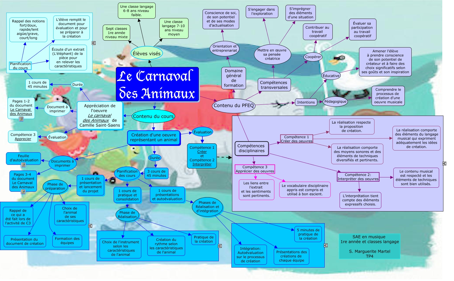 This Concept Map, created with IHMC CmapTools, has information related to: Le Carnaval des Animaux, Création d'une oeuvre représentant un animal Documents à imprimer Feuille d'autoévaluation, Création d'une oeuvre représentant un animal Documents à imprimer Pages 3-4 du document Le Carnaval des Animaux, Le Carnaval des Animaux Élèves visés Une classe langage 6-8 ans niveau faible., Création d'une oeuvre représentant un animal Durée 3 cours de 45 minutes, Compétences transversales Mettre en œuvre sa pensée créatrice S’engager dans l’exploration, Compétences disciplinaires Compétence 2: Interpréter des oeuvres L’interprétation tient compte des éléments expressifs choisis., 1 cours de présentation et lancement du projet Phase de préparation Formation des équipes, Compétences disciplinaires Compétence 2: Interpréter des oeuvres Le contenu musical est respecté et les éléments de techniques sont bien utilisés., 3 cours de 45 minutes Planification des cours 1 cours de présentation et lancement du projet, 1 cours de présentations et autoévaluation Phases de Réalisation et d'intégration 5 minutes de pratique de la création, 1 cours de présentations et autoévaluation Phases de Réalisation et d'intégration Intégration: Autoévaluation sur le processus de création, Compétences disciplinaires Compétence 3 Apprécier des oeuvres Le vocabulaire disciplinaire appris est compris et utilisé à bon escient., 1 cours de présentation et lancement du projet Phase de préparation Présentation du document de création, 1 cours de pratique et consolidation Phase de Réalisation Pratique de la création, Compétences disciplinaires Compétence 1 Créer des oeuvres La réalisation respecte la proposition de création., Intentions Éducative Amener l'élève à prendre conscience de son potentiel de créateur et à faire des choix significatifs selon ses goûts et son inspiration, 1 cours de présentation et lancement du projet Phase de préparation Rappel de ce qui a été fait lors de l'activité de C3, Le Carnaval des Animaux Contenu du cours Création d'une oeuvre représentant un animal, Domaine général de formation Orientation et entreprenariat Conscience de soi, de son potentiel et de ses modes d’actualisation, Compétences disciplinaires Compétence 1 Créer des oeuvres La réalisation comporte des moyens sonores et des éléments de techniques diversifiés et pertinents.