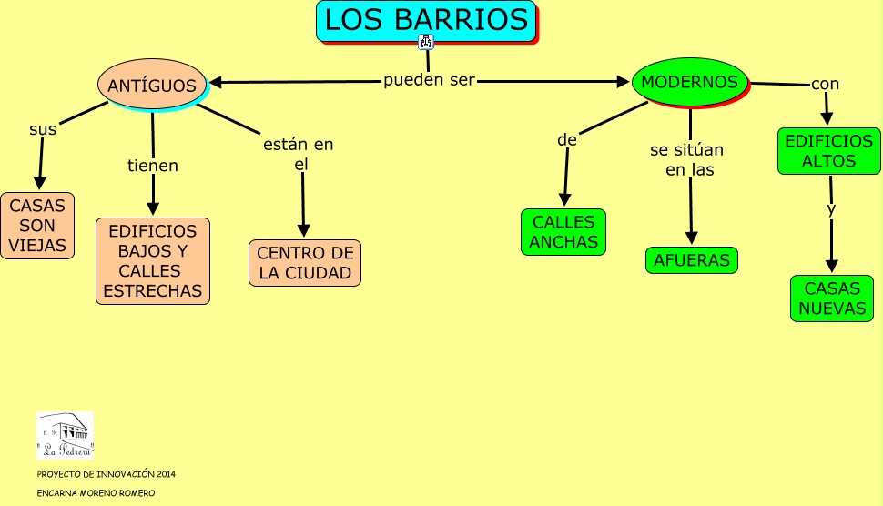 Este Cmap, tiene información relacionada con: BARRIOS 2º, EDIFICIOS ALTOS y CASAS NUEVAS, LOS BARRIOS pueden ser ANT�?GUOS, ANT�?GUOS están en el CENTRO DE LA CIUDAD, MODERNOS con EDIFICIOS ALTOS, MODERNOS se sitúan en las AFUERAS, MODERNOS de CALLES ANCHAS, LOS BARRIOS pueden ser MODERNOS, ANT�?GUOS tienen EDIFICIOS BAJOS Y CALLES ESTRECHAS, ANT�?GUOS sus CASAS SON VIEJAS