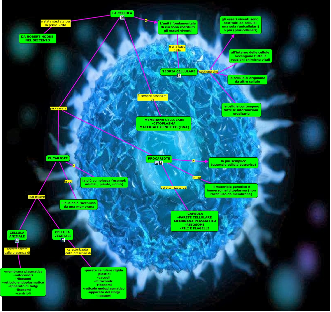 Questa Cmap, creata con IHMC CmapTools, contiene informazioni relative a: cellula, le cellule contengono tutte le informazioni ereditarie sostiene che gli esseri viventi sono costituiti da cellule: una sola (unicellulari) o più (pluricellulari), L'unità fondamentale di cui sono costituiti gli esseri viventi è alla base della TEORIA CELLULARE, le cellule si originano da altre cellule sostiene che gli esseri viventi sono costituiti da cellule: una sola (unicellulari) o più (pluricellulari), EUCARIOTE è la più complessa (esempi: animali, piante, uomo), all'interno delle cellule avvengono tutte le reazioni chimiche vitali sostiene che gli esseri viventi sono costituiti da cellule: una sola (unicellulari) o più (pluricellulari), PROCARIOTE può essere EUCARIOTE, LA CELLULA è L'unità fondamentale di cui sono costituiti gli esseri viventi, EUCARIOTE può essere CELLULA ANIMALE, LA CELLULA è stata studiata per la prima volta DA ROBERT HOOKE NEL SEICENTO, CELLULA ANIMALE caratterizzata dalla presenza di -membrana plasmatica -mitocondri -ribosomi -reticolo endoplasmatico -apparato di Golgi -lisosomi -centrioli, PROCARIOTE in cui il materiale genetico è immerso nel citoplasma (non racchiuso da membrana), PROCARIOTE caratterizzata da -CAPSULA -PARETE CELLULARE -MEMBRANA PLASMATICA -RIBOSOMI -PILI E FLAGELLI, LA CELLULA può essere EUCARIOTE, CELLULA VEGETALE può essere CELLULA ANIMALE, EUCARIOTE in cui il nucleo è racchiuso da una membrana, PROCARIOTE è la più semplice (esempio cellula batterica), CELLULA VEGETALE caratterizzata dalla presenza di -parete cellulare rigida -plastidi -vacuoli -mitocondri -ribosomi -reticolo endoplasmatico -apparato del Golgi -lisosomi, TEORIA CELLULARE sostiene che gli esseri viventi sono costituiti da cellule: una sola (unicellulari) o più (pluricellulari), LA CELLULA è sempre costituita da -MEMBRANA CELLULARE -CITOPLASMA -MATERIALE GENETICO (DNA)