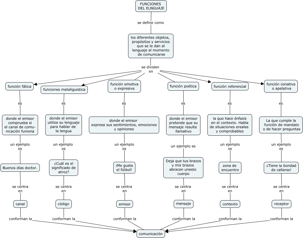 Este Cmap, tiene información relacionada con: FUNCIONES-LENGUAJE, función referencial es la que hace énfasis en el contexto. Habla de situaciones ereales y comprobables, código conforman la comunicación, los diferentes objetos, propósitos y servicios que se le dan al lenguaje al momento de comunicarse se dividen en función conativa o apelativa, canal conforman la comunicación, los diferentes objetos, propósitos y servicios que se le dan al lenguaje al momento de comunicarse se dividen en función emotiva o expresiva, función conativa o apelativa es La que cumple la función de mandato o de hacer preguntas, ¿Cuál es el significado de atroz? se centra en código, receptor conforman la comunicación, La que cumple la función de mandato o de hacer preguntas un ejemplo es ¿Tiene la bondad de callarse!, los diferentes objetos, propósitos y servicios que se le dan al lenguaje al momento de comunicarse se dividen en función poética, funciones metaliguistica es donde el emisor utiliza su lenguaje para hablar de la lengua, los diferentes objetos, propósitos y servicios que se le dan al lenguaje al momento de comunicarse se dividen en función referencial, donde el emisor comprueba si el canal de comu- nicación funiona un ejemplo es Buenos días doctor., los diferentes objetos, propósitos y servicios que se le dan al lenguaje al momento de comunicarse se dividen en funciones metaliguistica, los diferentes objetos, propósitos y servicios que se le dan al lenguaje al momento de comunicarse se dividen en función fática, FUNCIONES DEL ELNGUAJE se define como los diferentes objetos, propósitos y servicios que se le dan al lenguaje al momento de comunicarse, función emotiva o expresiva es donde el emisor expresa sus sentimientos, emociones y opiniones, emisor conforman la comunicación, donde el emisor pretende que su mensaje resulte llamativo un ejemplo es Deja que tus brazos y mis brazos abracen unesto cuerpo, función fática es donde el emisor comprueba si el canal de comu- nicación funiona