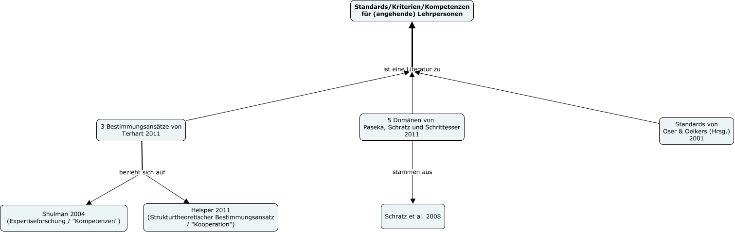 Dieses mit IHMC CmapTools erstellte CMap hat Informationen bezüglich: Literatur für Fragebogen, 3 Bestimmungsansätze von Terhart 2011 bezieht sich auf Helsper 2011 (Strukturtheoretischer Bestimmungsansatz / "Kooperation"), 5 Domänen von Paseka, Schratz und Schrittesser 2011 ist eine Literatur zu Standards/Kriterien/Kompetenzen für (angehende) Lehrpersonen, 3 Bestimmungsansätze von Terhart 2011 ist eine Literatur zu Standards/Kriterien/Kompetenzen für (angehende) Lehrpersonen, Standards von Oser & Oelkers (Hrsg.) 2001 ist eine Literatur zu Standards/Kriterien/Kompetenzen für (angehende) Lehrpersonen, 5 Domänen von Paseka, Schratz und Schrittesser 2011 stammen aus Schratz et al. 2008, 3 Bestimmungsansätze von Terhart 2011 bezieht sich auf Shulman 2004 (Expertiseforschung / "Kompetenzen")