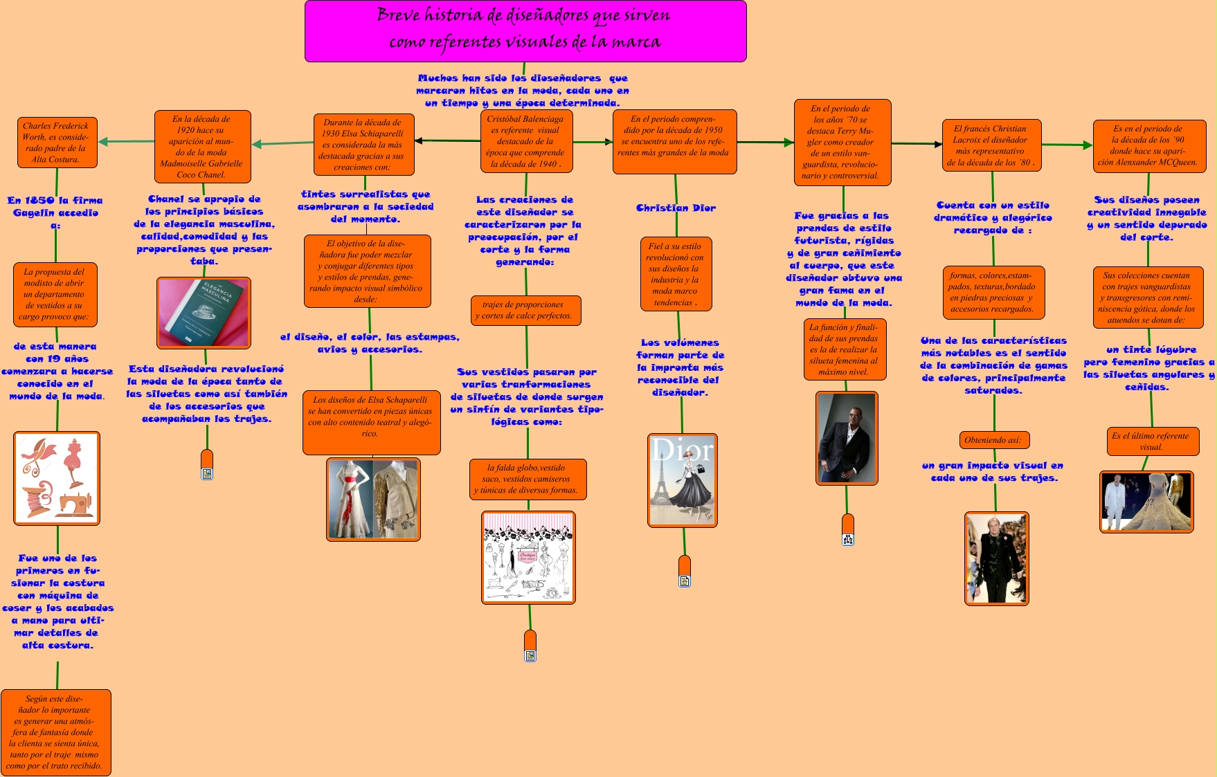 Este Cmap, tiene información relacionada con: mapa concptual con todo los enlaces, Obteniendo así: un gran impacto visual en cada uno de sus trajes. ????, En el periodo de los años ´70 se destaca Terry Mu- gler como creador de un estilo van- guardista, revolucio- nario y controversial. Fue gracias a las prendas de estilo futurista, rígidas y de gran ceñimiento al cuerpo, que este diseñador obtuvo una gran fama en el mundo de la moda. La función y finali- dad de sus prendas es la de realizar la silueta femenina al máximo nivel., En la década de 1920 hace su aparición al mun- do de la moda Madmoiselle Gabrielle Coco Chanel. Chanel se apropio de los principios básicos de la elegancia masculina, calidad,comodidad y las proporciones que presen- taba., En el periodo de los años ´70 se destaca Terry Mu- gler como creador de un estilo van- guardista, revolucio- nario y controversial. El francés Christian Lacroix el diseñador más representativo de la década de los ´80., Cristóbal Balenciaga es referente visual destacado de la época que comprende la década de 1940. En el periodo compren- dido por la década de 1950 se encuentra uno de los refe- rentes más grandes de la moda, El francés Christian Lacroix el diseñador más representativo de la década de los ´80. Cuenta con un estilo dramático y alegórico recargado de : formas, colores,estam- pados, texturas,bordado en piedras preciosas y accesorios recargados., Breve historia de diseñadores que sirven como referentes visuales de la marca Muchos han sido los dioseñadores que marcaron hitos en la moda, cada uno en un tiempo y una época determinada. Cristóbal Balenciaga es referente visual destacado de la época que comprende la década de 1940., Es el último referente visual. ????, Los diseños de Elsa Schaparelli se han convertido en piezas únicas con alto contenido teatral y alegó- rico., La función y finali- dad de sus prendas es la de realizar la silueta femenina al máximo nivel. ????, Fiel a su estilo revolucionó con sus diseños la industria y la moda marco tendencias. Los volúmenes forman parte de la impronta más reconocible del diseñador., El objetivo de la dise- ñadora fue poder mezclar y conjugar diferentes tipos y estilos de prendas, gene- rando impacto visual simbólico desde: el diseño, el color, las estampas, avios y accesorios. Los diseños de Elsa Schaparelli se han convertido en piezas únicas con alto contenido teatral y alegó- rico., Cristóbal Balenciaga es referente visual destacado de la época que comprende la década de 1940. En el periodo de los años ´70 se destaca Terry Mu- gler como creador de un estilo van- guardista, revolucio- nario y controversial., La propuesta del modisto de abrir un departamento de vestidos a su cargo provoco que: de esta manera con 19 años comenzara a hacerse conocido en el mundo de la moda., Cristóbal Balenciaga es referente visual destacado de la época que comprende la década de 1940. Las creaciones de este diseñador se caracterizaron por la preocupación, por el corte y la forma generando: trajes de proporciones y cortes de calce perfectos., formas, colores,estam- pados, texturas,bordado en piedras preciosas y accesorios recargados. Una de las características más notables es el sentido de la combinación de gamas de colores, principalmente saturados. Obteniendo así:, Es en el periodo de la década de los ´90 donde hace su apari- ción Alenxander MCQueen. Sus diseños poseen creatividad innegable y un sentido depurado del corte. Sus colecciones cuentan con trajes vanguardistas y transgresores con remi- niscencia gótica, donde los atuendos se dotan de:, Fue uno de los primeros en fu- sionar la costura con máquina de coser y los acabados a mano para ulti- mar detalles de alta costura. Según este dise- ñador lo importante es generar una atmós- fera de fantasía donde la clienta se sienta única, tanto por el traje mismo como por el trato recibido., Esta diseñadora revolucionó la moda de la época tanto de las siluetas como así también de los accesorios que acompañaban los trajes., ????