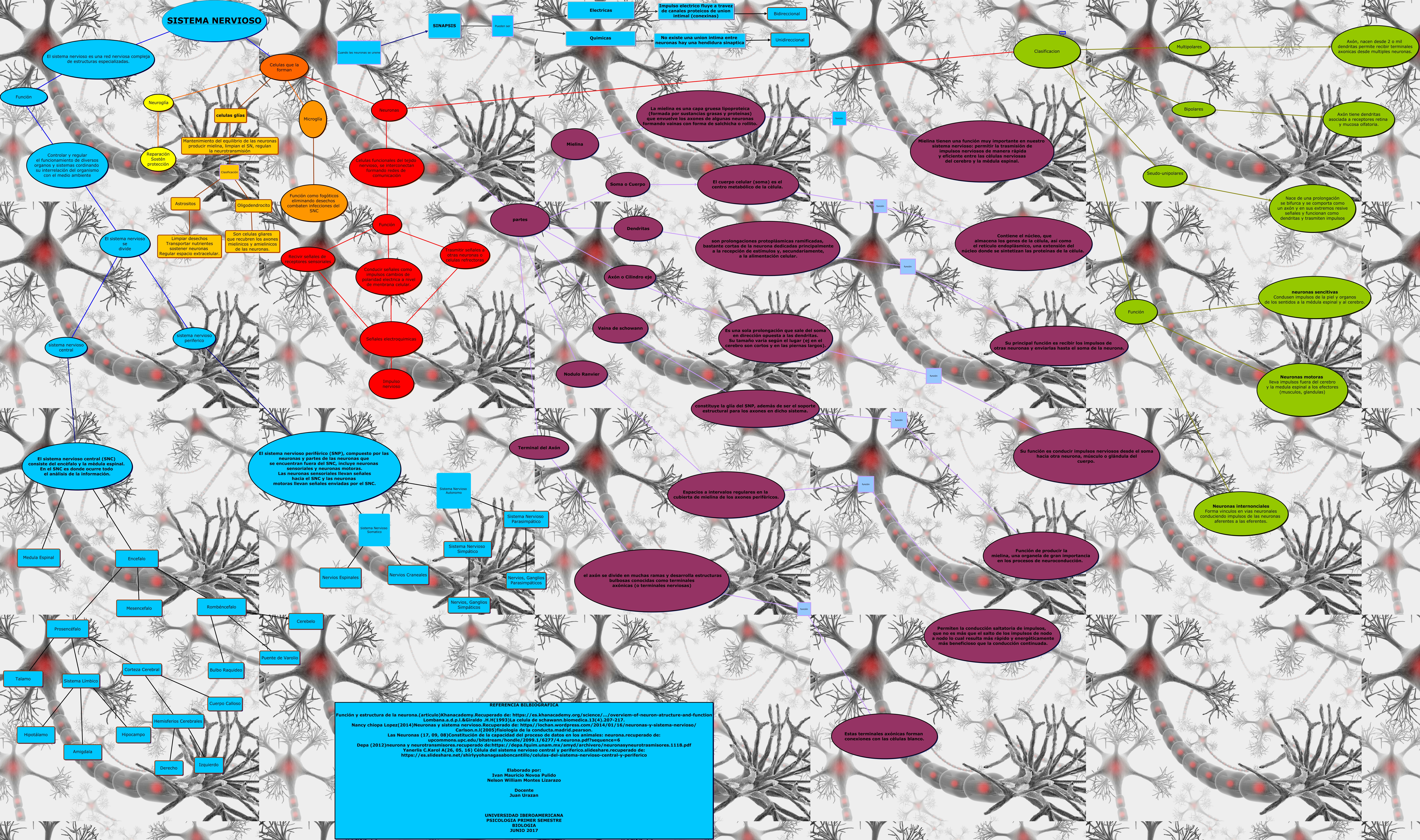 Este Cmap, tiene información relacionada con: sistema nervioso, Encefalo ???? Prosencéfalo, El sistema nervioso se divide ???? sistema nervioso periferico, Celulas funcionales del tejido nervioso, se interconectan formando redes de comunicación ???? Función, partes ???? Mielina, Microglía ???? Función como fogóticos eliminando desechos combaten infecciones del SNC, El sistema nervioso se divide ???? sistema nervioso central, Clasificacion ???? Seudo-unipolares, Función ???? Conducir señales como impulsos cambios de polaridad electrica a nivel de menbrana celular., partes ???? Dendritas, Axón o Cilindro eje ???? Es una sola prolongación que sale del soma en dirección opuesta a las dendritas. Su tamaño varía según el lugar (ej en el cerebro son cortos y en las piernas largos)., Neuronas ???? Clasificacion, Mantenimiento del equilibrio de las neuronas producir mielina, limpian el SN, regulan la neurotransmisión Clasificación Astrositos, Corteza Cerebral ???? Hemisferios Cerebrales, Función ???? neuronas sencitivas Condusen impulsos de la piel y organos de los sentidos a la médula espinal y al cerebro., Sistema Nervioso Simpático ???? Nervios, Ganglios Simpáticos, Neuronas Cuando las neuronas se unene SINAPSIS, Bipolares ???? Axón tiene dendritas asociada a receptores retina y mucosa olfatoria., Mantenimiento del equilibrio de las neuronas producir mielina, limpian el SN, regulan la neurotransmisión Clasificación Oligodendrocito, Encefalo ???? Mesencefalo, Rombéncefalo ???? Puente de Varolio