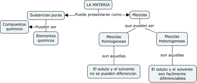 Este Cmap, tiene información relacionada con: Mezclas, Mezclas Heterogeneas son aquellas El soluto y el solvente son facilmente diferenciables, Mezclas Homogeneas son aquellas El soluto y el solvente no se pueden diferenciar., Mezclas que pueden ser Mezclas Heterogeneas, LA MATERIA Puede presentarse como Mezclas, Mezclas que pueden ser Mezclas Homogeneas, Sustancias puras Pueden ser Compuestos quimicos, Sustancias puras Pueden ser Elementos quimicos, LA MATERIA Puede presentarse como Sustancias puras