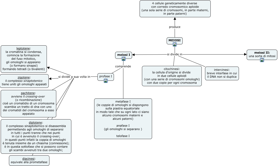 Questa Cmap, creata con IHMC CmapTools, contiene informazioni relative a: meiosi, MEIOSI produce 4 cellule geneticamente diverse con corredo cromosomico aploide (una sola serie di cromosomi, in parte materni, in parte paterni), profase I si divide a sua volta in pachitene: avviene il crossing-over (o ricombinazione) cioè un cromatidio di un cromosoma scambia un tratto di dna con uno dei cromatidi del cromosoma a esso appaiato, profase I si divide a sua volta in diplotene: il complesso sinaptotemico si disassembla permettendo agli omologhi di separarsi in tutti i punti tranne che nei punti in cui è avvenuto il crossing-over; in questi punti infatti la coppia di omologhi è tenuta insieme da un chiasma (connessone); è in questa sottofase che si possono contare gli scambi avvenuti tra due omologhi;, MEIOSI si divide in intercinesi: breve interfase in cui il DNA non si duplica, MEIOSI si divide in citochinesi: la cellula d'origine si divide in due cellule aploidi (con una serie di cromosomi omologhi) con due copie per ogni cromosoma, MEIOSI si divide in meiosi I, profase I si divide a sua volta in leptotene: la cromatina si condensa, comincia la formazione del fuso mitotico, gli omologhi si appaiano (o formano sinapsi) formando tetradi (o bivalenti), meiosi I comprende profase I, profase I si divide a sua volta in diacinesi: equivale alla prometafase, profase I si divide a sua volta in zigotene: il complesso sinaptotenico tiene uniti gli omologhi appaiati, meiosi I comprende metafase I (le coppie di omologhi si dispongono sulla piastra equatoriale in modo tale che su ogni lato ci siano alcuno cromosomi materni e alcuni paterni) anafase I (gli omologhi si separano ) telofase I, MEIOSI si divide in meiosi II: una sorta di mitosi