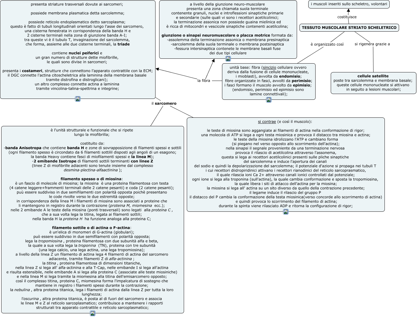 Questa Cmap, creata con IHMC CmapTools, contiene informazioni relative a: TESSUTO MUSCOLARE STRIATO SCHELETRICO, unità base: fibra (sincizio cellulare ovvero deriva dalla fusione di cellule mononucleate, i mioblasti), avvolta da endomisio; fibre organizzate in fasci, avvolti da perimisio; i fasci formano il muscolo avvolto da epimisio; (endomisio, perimisio ed epimisio sono lamine connettivali); la fibra a livello della giunzione neuro-muscolare presenta una zona chiamata suola terminale contenente granuli, nuclei e introflessioni sinaptiche primarie e secondarie (sulle quali vi sono i recettori acetilcolinici; la terminazione assonica non possiede guaina mielinica ed è ricca di mitocondri e vescicole sinaptiche contenenti acetilcolina; giunzione o sinapsi neuromuscolare o placca motrice formata da: -assolemma della terminazione assonica o membrana presinaptica -sarcolemma della suola terminale o membrana postsinaptica -fessura intersinaptica contenete le membrane basali fuse dei due tipi cellulare, TESSUTO MUSCOLARE STRIATO SCHELETRICO costituisce i muscoli inseriti sullo scheletro, volontari, unità base: fibra (sincizio cellulare ovvero deriva dalla fusione di cellule mononucleate, i mioblasti), avvolta da endomisio; fibre organizzate in fasci, avvolti da perimisio; i fasci formano il muscolo avvolto da epimisio; (endomisio, perimisio ed epimisio sono lamine connettivali); la fibra presenta striature trasversali dovute ai sarcomeri; possiede membrana plasmatica detta sarcolemma; possiede reticolo endoplasmatico detto sarcoplasma; questo è fatto di tubuli longitudinali orientati lungo l'asse dei sarcomero, una cisterna fenestrata in corrispondenza della banda H e 2 cisterne terminali nella zona di giunzione banda A-I; tra queste vi è il tubulo T, invaginazione del sarcolemma, che forma, assieme alle due cisterne terminali, la triade contiene nuclei peiferici e un gran numero di strutture dette miofibrille, le quali sono divise in sarcomeri; presenta i costameri, strutture che connettono l'apparato contrattile con la ECM; il DGC connette l'actina citoscheletrica alla laminina della membrana basale tramite distrofina e distroglicani); un altro complesso connette actina a laminina tramite vincolina-talina-spettrina e integrine;, presenta striature trasversali dovute ai sarcomeri; possiede membrana plasmatica detta sarcolemma; possiede reticolo endoplasmatico detto sarcoplasma; questo è fatto di tubuli longitudinali orientati lungo l'asse dei sarcomero, una cisterna fenestrata in corrispondenza della banda H e 2 cisterne terminali nella zona di giunzione banda A-I; tra queste vi è il tubulo T, invaginazione del sarcolemma, che forma, assieme alle due cisterne terminali, la triade contiene nuclei peiferici e un gran numero di strutture dette miofibrille, le quali sono divise in sarcomeri; presenta i costameri, strutture che connettono l'apparato contrattile con la ECM; il DGC connette l'actina citoscheletrica alla laminina della membrana basale tramite distrofina e distroglicani); un altro complesso connette actina a laminina tramite vincolina-talina-spettrina e integrine; il sarcomero si contrae (e così il muscolo): le teste di miosina sono aggangiate ai filamenti di actina nella conformazione di rigor; una molecola di ATP si lega a ogni testa miosinica e provoca il distacco tra miosina e actina; le teste della miosina idrolizzano l'ATP e cambiano forma (si piegano nel verso opposto allo scorrimento dell'actina); nella sinapsi il segnale proveniente da una terminazione nervosa provoca il rilascio di acetilcolina attraverso l'assonema, questa si lega ai recettori acetilcolinici presenti sulle pliche sinaptiche del sarcolemma e induce l'apertura dei canali del sodio e quindi la depolarizzazione del sarcolemma; il potenziale d'azione si propaga nei tubuli T i cui recettori diidropiridinici attivano i recettori rianodinici del reticolo sarcoprasmatico, il quale rilascia ioni Ca 2+ attraverso canali ionici controllati dal potenziale; ogni ione si lega alla troponina (sull'actina), la quale cambia conformazione e sposta la tropomiosina, la quale libera i siti di attacco dell'actina per la miosina; la miosina si lega all' actina su un sito diverso da quello della contrazione precedente; il legame induce il rilascio del gruppo P il distacco del P cambia la conformazione della testa miosinica(verso concorde allo scorrimento di actina) e quindi provoca lo scorrimento del filamento di actina; durante la spinta viene rilasciato ADP e ritorna la configurazione di rigor;, TESSUTO MUSCOLARE STRIATO SCHELETRICO è organizzato così unità base: fibra (sincizio cellulare ovvero deriva dalla fusione di cellule mononucleate, i mioblasti), avvolta da endomisio; fibre organizzate in fasci, avvolti da perimisio; i fasci formano il muscolo avvolto da epimisio; (endomisio, perimisio ed epimisio sono lamine connettivali);, presenta striature trasversali dovute ai sarcomeri; possiede membrana plasmatica detta sarcolemma; possiede reticolo endoplasmatico detto sarcoplasma; questo è fatto di tubuli longitudinali orientati lungo l'asse dei sarcomero, una cisterna fenestrata in corrispondenza della banda H e 2 cisterne terminali nella zona di giunzione banda A-I; tra queste vi è il tubulo T, invaginazione del sarcolemma, che forma, assieme alle due cisterne terminali, la triade contiene nuclei peiferici e un gran numero di strutture dette miofibrille, le quali sono divise in sarcomeri; presenta i costameri, strutture che connettono l'apparato contrattile con la ECM; il DGC connette l'actina citoscheletrica alla laminina della membrana basale tramite distrofina e distroglicani); un altro complesso connette actina a laminina tramite vincolina-talina-spettrina e integrine; il sarcomero è l'unità strutturale e funzionale che si ripete lungo la miofibrilla; costituito da: -banda Anisotropa che contiene banda H e zone di sovrapposizione di filamenti spessi e sottili (ogni filamento spesso è circondato da 6 filame