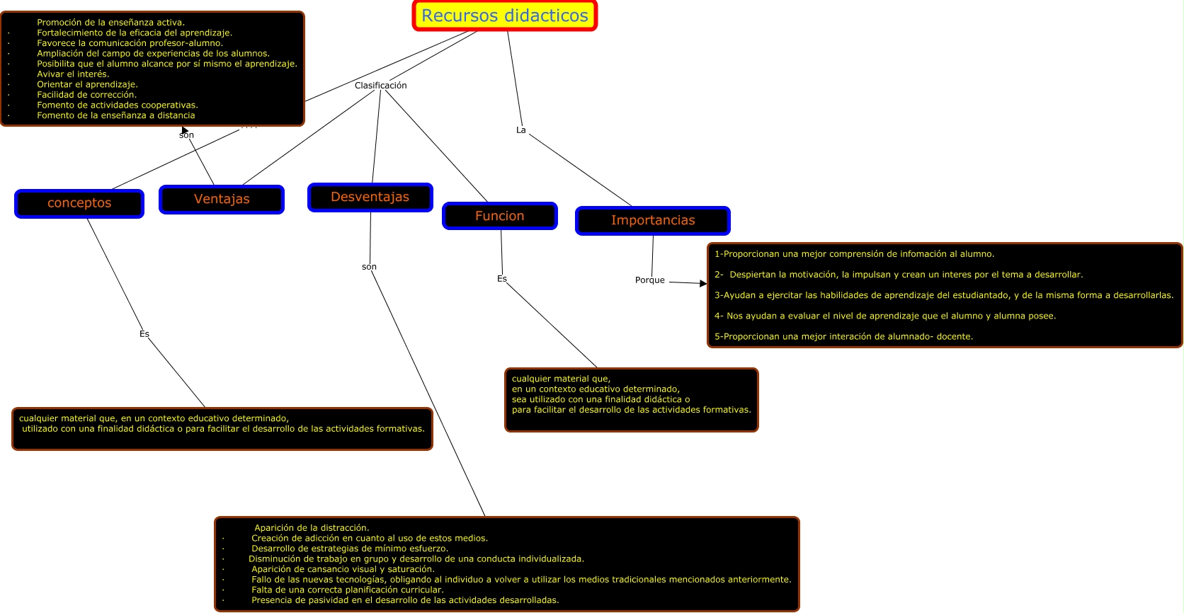 Este Cmap, tiene información relacionada con: Recursos didácticos, Recursos didacticos Clasificación Funcion, conceptos Es cualquier material que, en un contexto educativo determinado, utilizado con una finalidad didáctica o para facilitar el desarrollo de las actividades formativas., Recursos didacticos La Importancias, Ventajas son . Promoción de la enseñanza activa. · Fortalecimiento de la eficacia del aprendizaje. · Favorece la comunicación profesor-alumno. · Ampliación del campo de experiencias de los alumnos. · Posibilita que el alumno alcance por sí mismo el aprendizaje. · Avivar el interés. · Orientar el aprendizaje. · Facilidad de corrección. · Fomento de actividades cooperativas. · Fomento de la enseñanza a distancia., Funcion Es cualquier material que, en un contexto educativo determinado, sea utilizado con una finalidad didáctica o para facilitar el desarrollo de las actividades formativas., Desventajas son Aparición de la distracción. · Creación de adicción en cuanto al uso de estos medios. · Desarrollo de estrategias de mínimo esfuerzo. · Disminución de trabajo en grupo y desarrollo de una conducta individualizada. · Aparición de cansancio visual y saturación. · Fallo de las nuevas tecnologías, obligando al individuo a volver a utilizar los medios tradicionales mencionados anteriormente. · Falta de una correcta planificación curricular. · Presencia de pasividad en el desarrollo de las actividades desarrolladas., Recursos didacticos Clasificación Ventajas, Recursos didacticos ???? conceptos, Importancias Porque 1-Proporcionan una mejor comprensión de infomación al alumno. 2- Despiertan la motivación, la impulsan y crean un interes por el tema a desarrollar. 3-Ayudan a ejercitar las habilidades de aprendizaje del estudiantado, y de la misma forma a desarrollarlas. 4- Nos ayudan a evaluar el nivel de aprendizaje que el alumno y alumna posee. 5-Proporcionan una mejor interación de alumnado- docente., Recursos didacticos Clasificación Desventajas