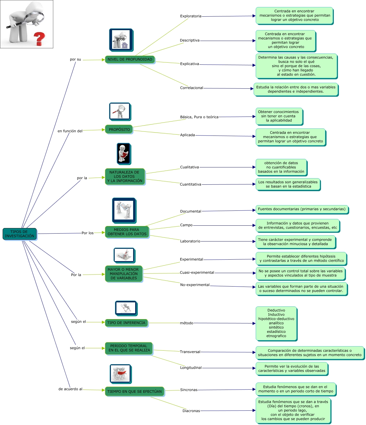 Este Cmap, tiene información relacionada con: Tipos de Investigación, MEDIOS PARA OBTENER LOS DATOS Campo Información y datos que provienen de entrevistas, cuestionarios, encuestas, etc, PERIODO TEMPORAL EN EL QUE SE REALIZA Longitudinal Permite ver la evolución de las características y variables observadas, TIPOS DE INVESTIGACIÓN de acuerdo al TIEMPO EN QUE SE EFECTÚAN, MEDIOS PARA OBTENER LOS DATOS Documental Fuentes documentarias (primarias y secundarias), NIVEL DE PROFUNDIDAD Correlacional Estudia la relación entre dos o mas variables dependientes e independientes., TIPOS DE INVESTIGACIÓN en función del PROPÓSITO, TIEMPO EN QUE SE EFECTÚAN Diacronas Estudia fenómenos que se dan a través (Día) del tiempo (cronos), en un periodo lago, con el objeto de verificar los cambios que se pueden producir, MAYOR O MENOR MANIPULACIÓN DE VARIABLES Cuasi-experimental No se posee un control total sobre las variables y aspectos vinculados al tipo de muestra, TIPOS DE INVESTIGACIÓN por su NIVEL DE PROFUNDIDAD, NIVEL DE PROFUNDIDAD Exploratoria Centrada en encontrar mecanismos o estrategias que permitan lograr un objetivo concreto, NATURALEZA DE LOS DATOS Y LA INFORMACIÓN Cualitativa obtención de datos no cuantificables basados en la información, NIVEL DE PROFUNDIDAD Explicativa Determina las causas y las consecuencias, busca no solo el qué sino el porque de las cosas, y cómo han llegado al estado en cuestión., NATURALEZA DE LOS DATOS Y LA INFORMACIÓN Cuantitativa Los resultados son generalizables se basan en la estadística, PROPÓSITO Aplicada Centrada en encontrar mecanismos o estrategias que permitan lograr un objetivo concreto, TIPOS DE INVESTIGACIÓN Por los MEDIOS PARA OBTENER LOS DATOS, TIEMPO EN QUE SE EFECTÚAN Sincronas Estudia fenómenos que se dan en el momento o en un periodo corto de tiempo, TIPOS DE INVESTIGACIÓN Por la MAYOR O MENOR MANIPULACIÓN DE VARIABLES, NIVEL DE PROFUNDIDAD Descriptiva Centrada en encontrar mecanismos o estrategias que permitan lograr un objetivo concreto, TIPO DE INFERENCIA método Deductivo Inductivo hipotético-deductivo analítico sintético estadístico etnografico, PROPÓSITO Básica, Pura o teórica Obtener conocimientos sin tener en cuenta la aplicabilidad