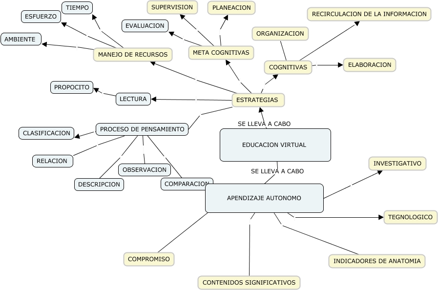 Este Cmap, tiene información relacionada con: MAPA, ESTRATEGIAS MANEJO DE RECURSOS, APENDIZAJE AUTONOMO INVESTIGATIVO, META COGNITIVAS EVALUACION, ESTRATEGIAS COGNITIVAS, COGNITIVAS ELABORACION, APENDIZAJE AUTONOMO COMPROMISO, ESTRATEGIAS LECTURA, ESTRATEGIAS PROCESO DE PENSAMIENTO, PROCESO DE PENSAMIENTO CLASIFICACION, LECTURA PROPOCITO, PROCESO DE PENSAMIENTO DESCRIPCION, EDUCACION VIRTUAL SE LLEVA A CABO APENDIZAJE AUTONOMO, PROCESO DE PENSAMIENTO RELACION, COGNITIVAS RECIRCULACION DE LA INFORMACION, PROCESO DE PENSAMIENTO COMPARACION, COGNITIVAS ORGANIZACION, MANEJO DE RECURSOS ESFUERZO, META COGNITIVAS PLANEACION, MANEJO DE RECURSOS AMBIENTE, MANEJO DE RECURSOS TIEMPO