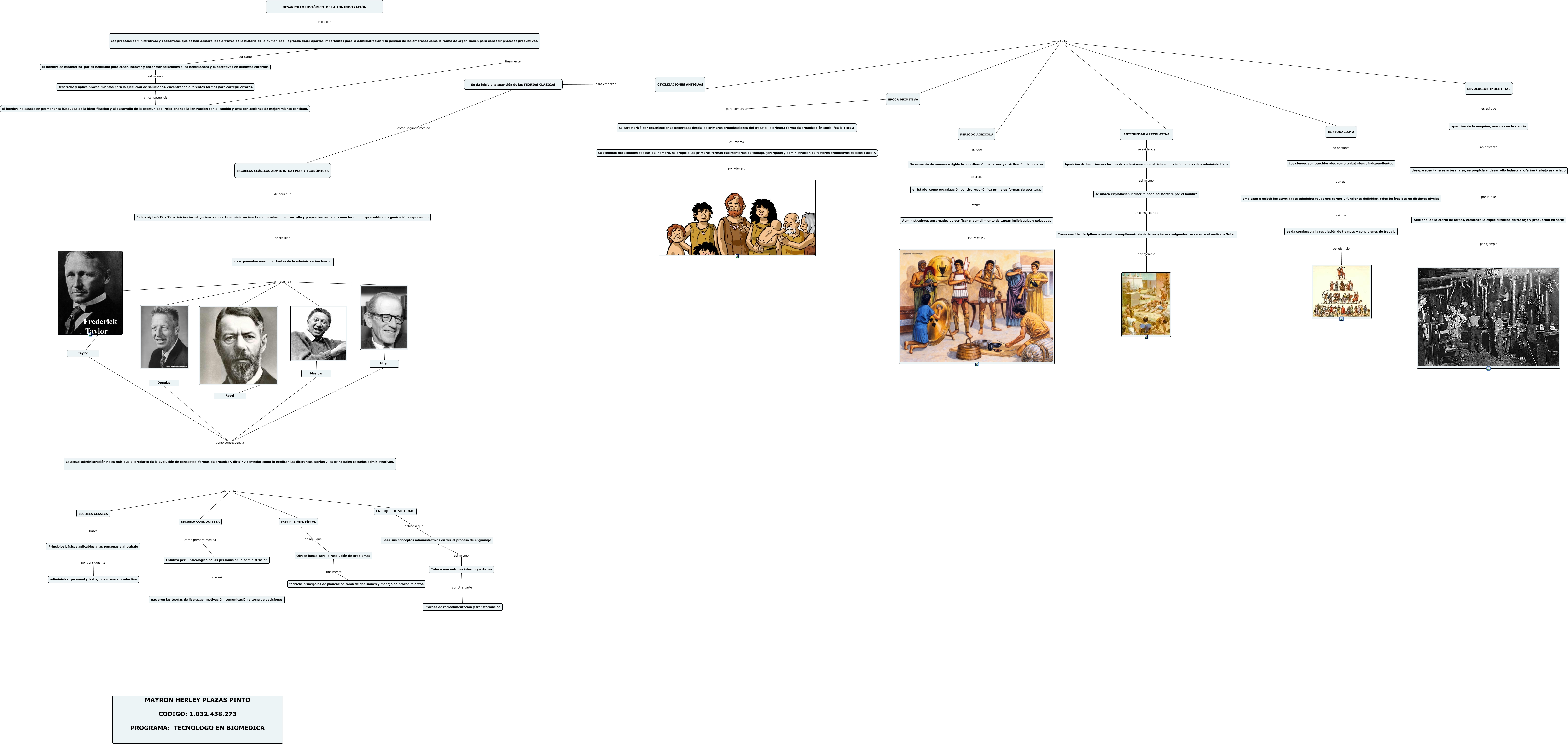 Este Cmap, tiene información relacionada con: DESARROLLO HISTÓRICO DE LA ADMINISTRACIÓN, por ejemplo Se atendian necesidades básicas del hombre, se propició las primeras formas rudimentarias de trabajo, jerarquías y administración de factores productivos basicos TIERRA, ???? en resumen, se marca explotación indiscriminada del hombre por el hombre asi mismo Aparición de las primeras formas de esclavismo, con estricta supervisión de los roles administrativos, Interacúan entorno interno y externo asi mismo Basa sus conceptos administrativos en ver el proceso de engranaje, Se caracterizó por organizaciones generadas desde las primeras organizaciones del trabajo, la primera forma de organización social fue la TRIBU para comenzar ÉPOCA PRIMITIVA, ???? en resumen ????, ESCUELAS CLÁSICAS ADMINISTRATIVAS Y ECONÓMICAS como segunda medida Se da inicio a la aparición de las TEORÍAS CLÁSICAS, Mayo ???? ????, La actual administración no es más que el producto de la evolución de conceptos, formas de organizar, dirigir y controlar como lo explican las diferentes teorías y las principales escuelas administrativas. como consecuencia Mayo, Desarrollo y aplico procedimientos para la ejecución de soluciones, encontrando diferentes formas para corregir errores. asi mismo El hombre se caracterizo por su habilidad para crear, innovar y encontrar soluciones a las necesidades y expectativas en distintos entornos, ÉPOCA PRIMITIVA en principio PERIODO AGRÍCOLA, aparición de la máquina, avances en la ciencia es asi que REVOLUCIÓN INDUSTRIAL, por ejemplo Administradores encargados de verificar el cumplimiento de tareas individuales y colectivas, Adicional de la oferta de tareas, comienza la especializacion de trabajo y produccion en serie por lo que desaparecen talleres artesanales, se propicia el desarrollo industrial ofertan trabajo asalariado, En los siglos XIX y XX se inician investigaciones sobre la administración, lo cual produce un desarrollo y proyección mundial como forma indispensable de organización empresarial. de aqui que ESCUELAS CLÁSICAS ADMINISTRATIVAS Y ECONÓMICAS, El hombre se caracterizo por su habilidad para crear, innovar y encontrar soluciones a las necesidades y expectativas en distintos entornos por tanto Los procesos administrativos y económicos que se han desarrollado a través de la historia de la humanidad, logrando dejar aportes importantes para la administración y la gestión de las empresas como la forma de organización para concebir procesos productivos., desaparecen talleres artesanales, se propicia el desarrollo industrial ofertan trabajo asalariado no obstante aparición de la máquina, avances en la ciencia, ESCUELA CLÁSICA ahora bien La actual administración no es más que el producto de la evolución de conceptos, formas de organizar, dirigir y controlar como lo explican las diferentes teorías y las principales escuelas administrativas., Principios básicos aplicables a las personas y al trabajo busca ESCUELA CLÁSICA, se da comienzo a la regulación de tiempos y condiciones de trabajo asi que empiezan a existir las aurotidades administrativas con cargos y funciones definidas, roles jerárquicos en distintos niveles