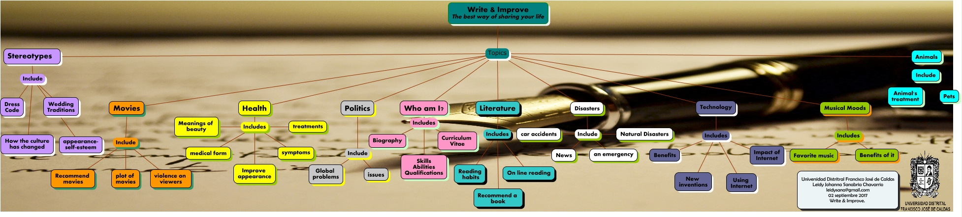 Este Cmap, tiene información relacionada con: Write&Improve, Literature Includes Recommend a book, Musical Moods Includes Favorite music, Politics Include Global problems, Write & Improve The best way of sharing your life Topics Technology, Disasters Include Natural Disasters, Health Includes symptoms, Write & Improve The best way of sharing your life Topics Literature, Politics Include issues, Write & Improve The best way of sharing your life Topics Who am I?, Stereotypes Include Dress Code, Who am I? Includes Curriculum Vitae, Literature Includes On line reading, Disasters Include News, Write & Improve The best way of sharing your life Topics Disasters, Write & Improve The best way of sharing your life Topics Movies, Technology Includes Impact of Internet, Movies Include violence on viewers, Musical Moods Includes Benefits of it, Technology Includes New inventions, Technology Includes Benefits