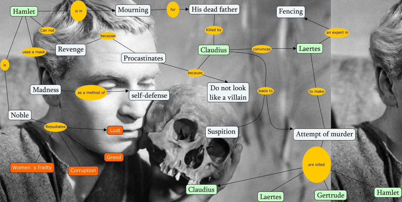Esse mapa conceitual, produzido no IHMC CmapTools, tem a informação relacionada a: Hamlet (good), Attempt of murder are killed Claudius, Laertes to make Attempt of murder, Hamlet uses a mask Madness, Noble Repudiates Corruption, Hamlet is Noble, Attempt of murder are killed Hamlet, Hamlet Can not Revenge, Noble Repudiates Lust, Attempt of murder are killed Laertes, Hamlet is in Mourning, Noble Repudiates Women´s frailty, Madness as a method of self-defense, Mourning for His dead father, Noble Repudiates Greed, Laertes an expert in Fencing, His dead father Killed by Claudius, Claudius leads to Suspition, Procastinates because Do not look like a villain, Attempt of murder are killed Gertrude, Claudius leads to Attempt of murder